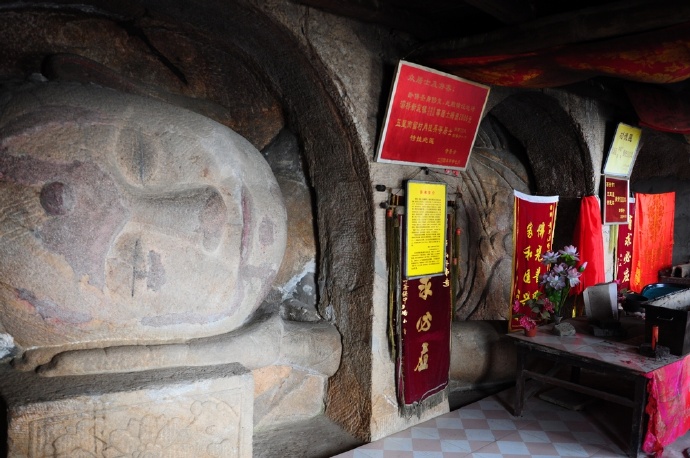 卧佛寺,原名摩崖石刻、岱顶、五层楼,是由凌空盘旋在悬崖峭壁上的五层转角楼而得名,它始建于唐朝武德初年(即公元618年)。卧佛得名来自底层的如来佛,他以石壁雕凿而成,侧躺在四拱石洞之中,身长十三米多,为全国室内四大石佛之一。