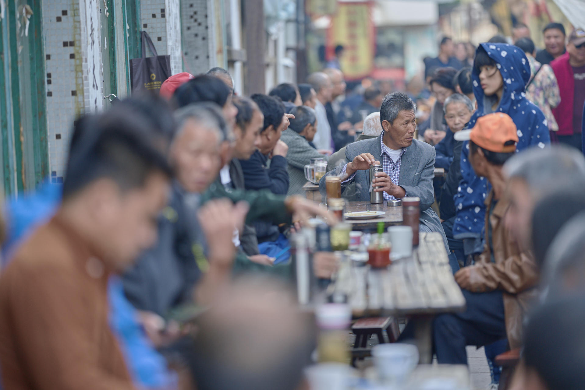 走在游埠的街头,秋日越来越高,街上的人流也越来越密。狭长的早茶街两边遍布旧式茶馆,一家挨着一家,紧靠墙根的是一张张长桌或方桌和一条条长长短短的板凳。时光荏苒,抹去了此地曾有的繁华,却挡不住当地村民喝早茶泡茶馆的嗜好。每天凌晨四点多,附近的村民三三两两来到这里,没有阳春白雪的高谈阔论,有的只是杯中不变的乡情和静逸的时光。