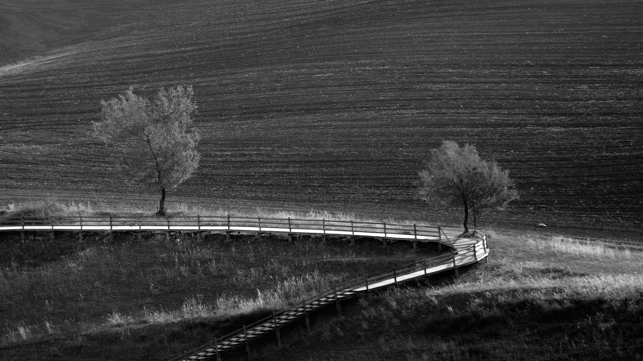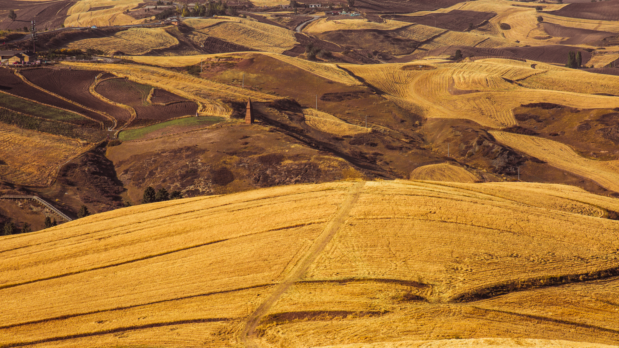 能看的到有些土地已经被勤劳的农民翻过了,褐红色的土地和金黄色的麦茬地对比鲜明。