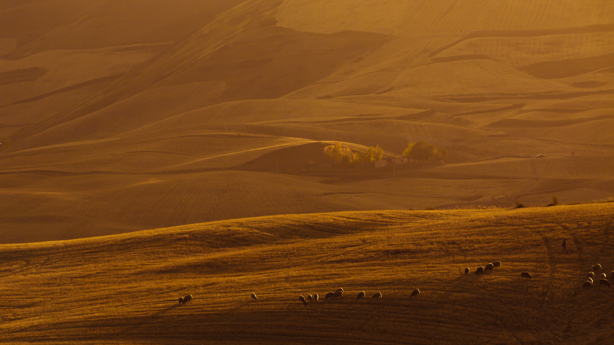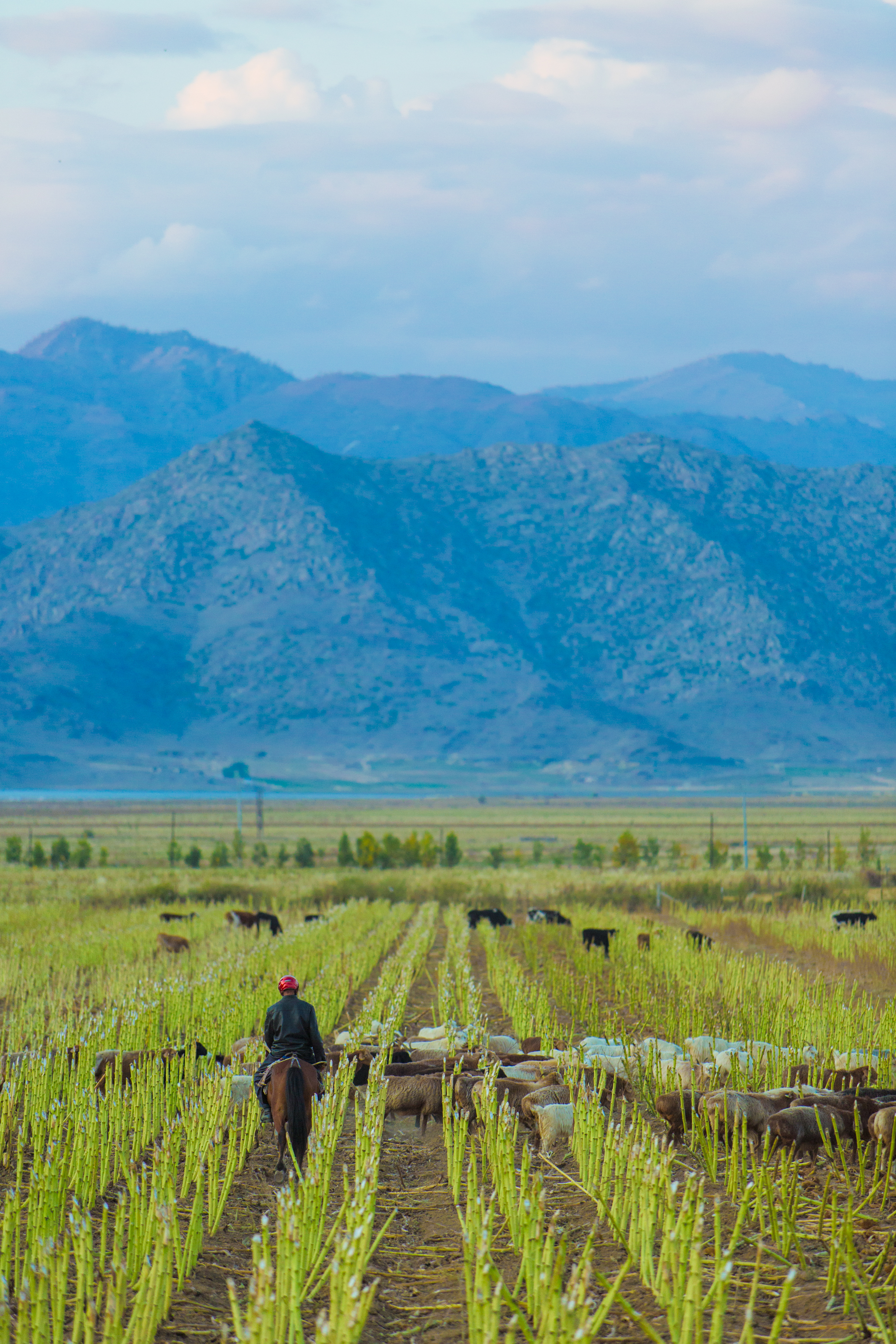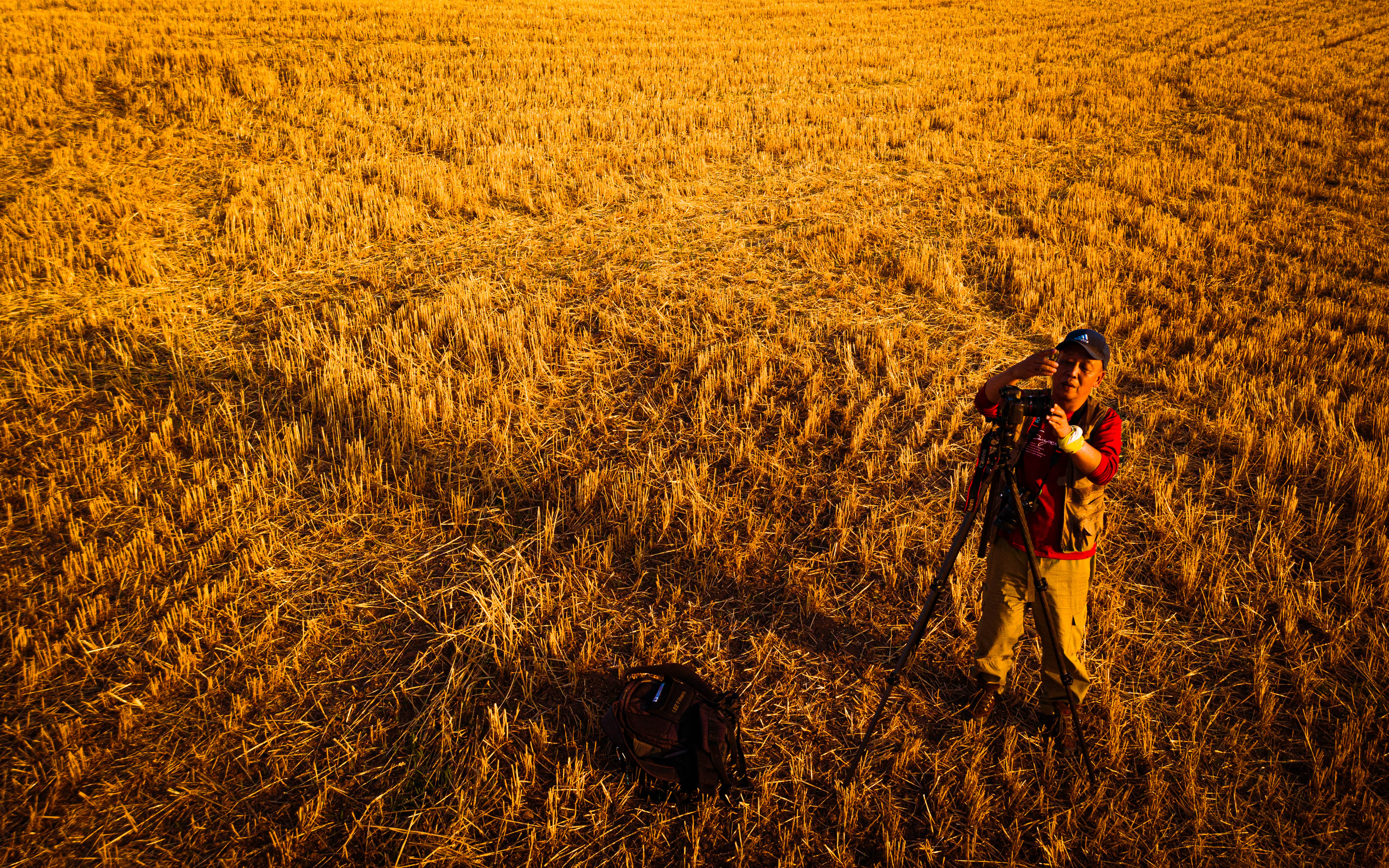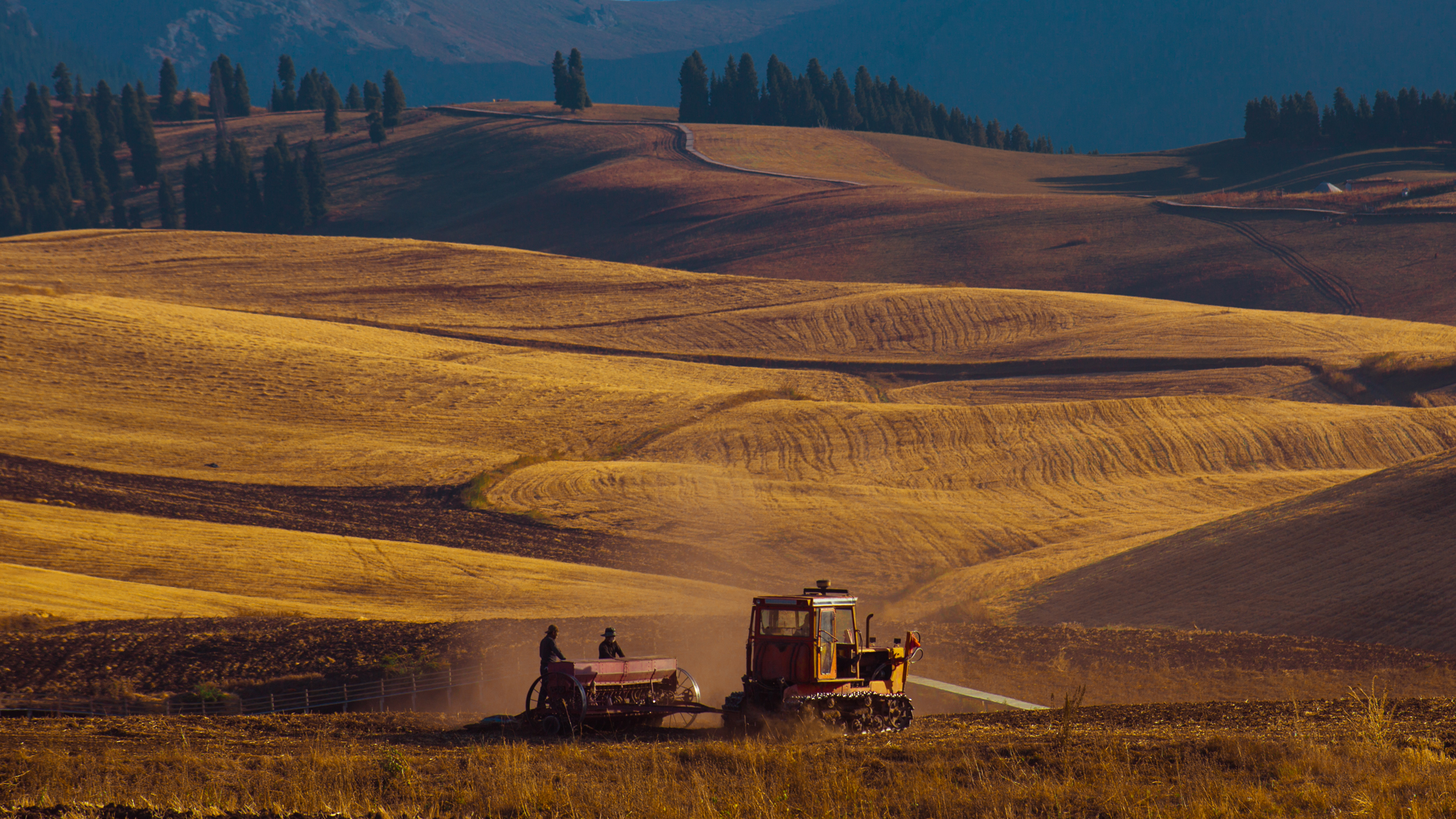 夕阳的逆光拍摄让所有游侠变得更加痴迷和专注,远处正在翻地的器械,远处吃草的牛羊和牧民,这一切在夕阳的金光照耀下熠熠生辉。