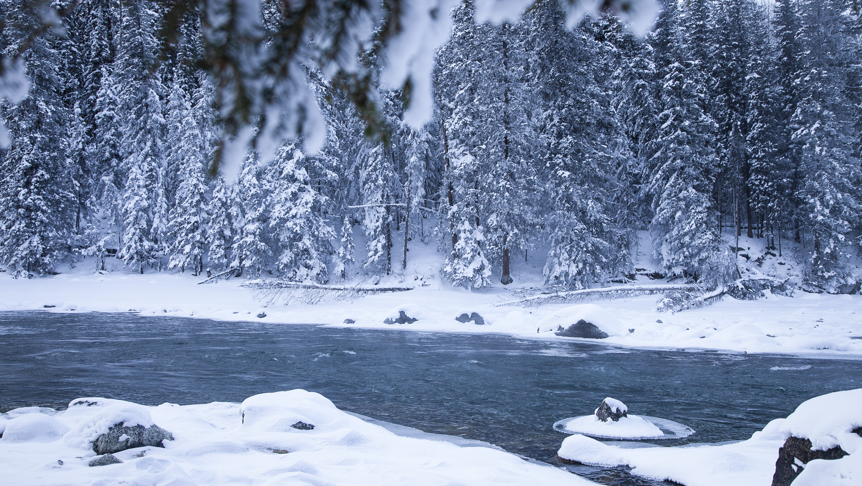 雾气蒸腾的水面,落满枝头的雪,岸边石头上堆满的“雪蘑菇”,纯净又和谐,冰冷又温暖。