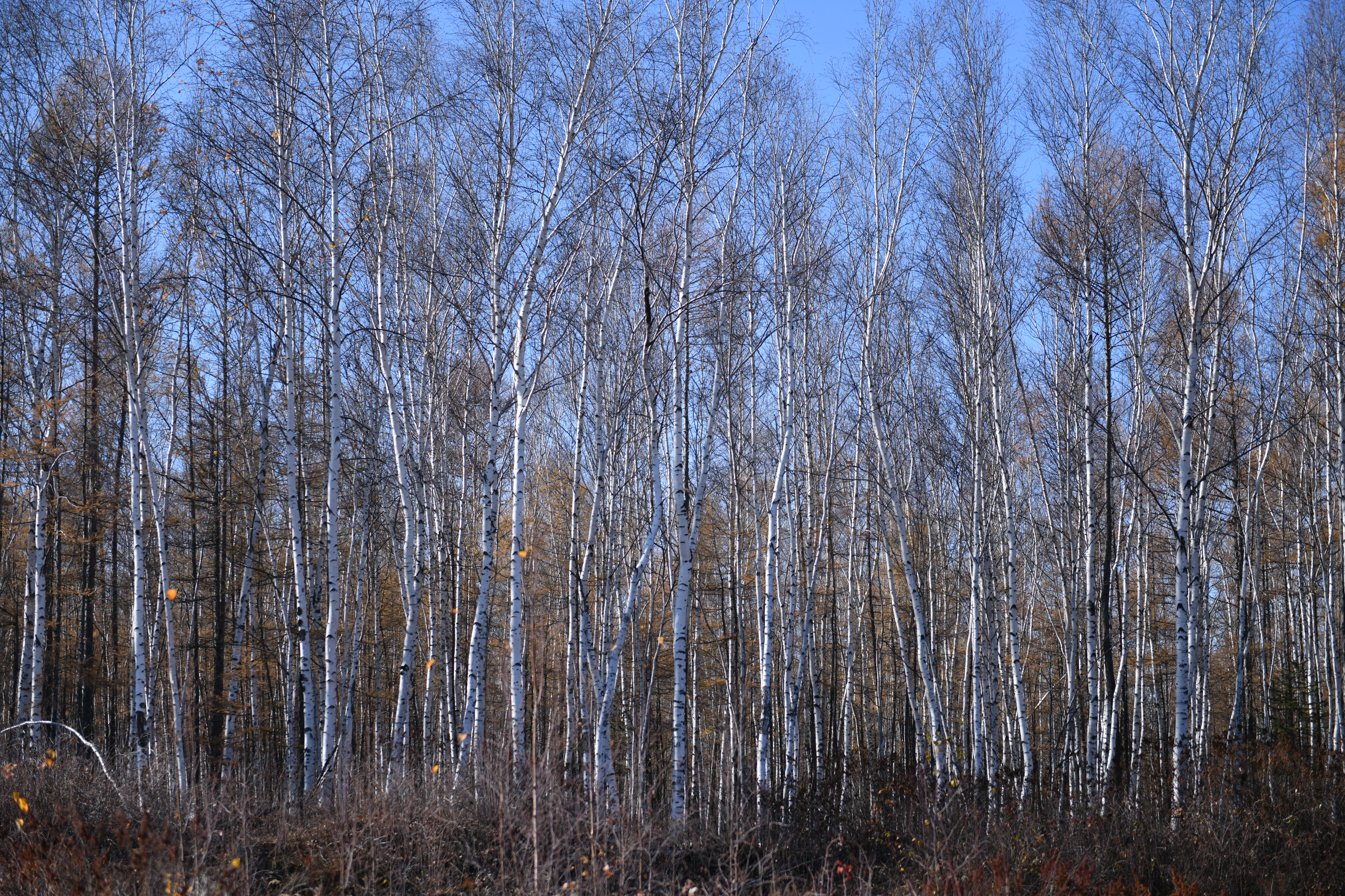 ( 二)我们沿着大兴安岭一直往北走,沿途的北国风光十分壮美,可惜不能停下来让我们拍拍拍,好遗憾!……“天怜吾心”!巧遇半路因修路塞车……雀跃的我们像彩蝶一样扑向那片银白色的白桦林
