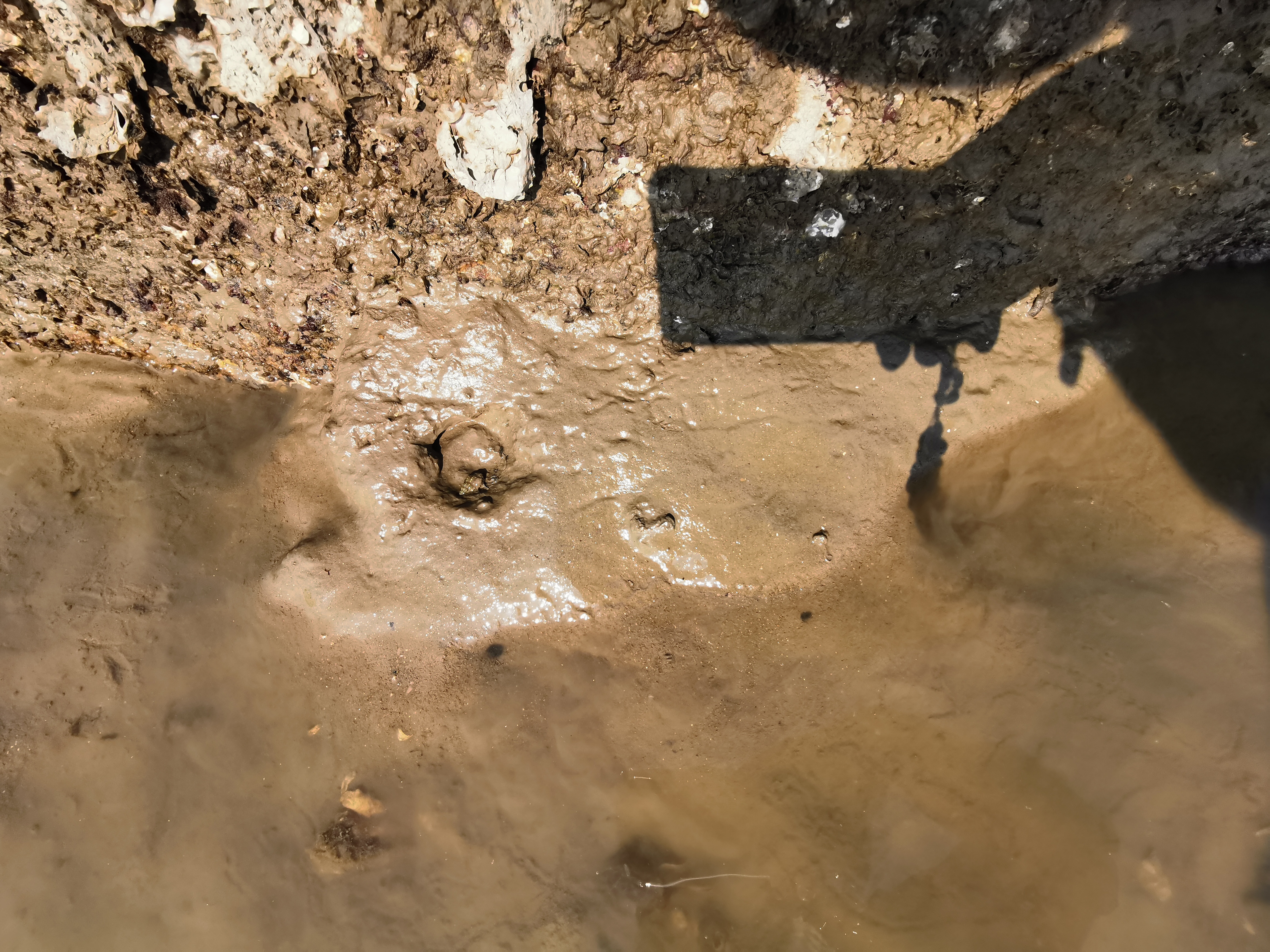 小洪师傅先带我们换上雨鞋,大家兴奋地奔向沙滩。小洪耐心地指点我们辩识螃蟹洞以及他们爬行留下的痕迹,教我们如何找海瓜子,捉皮皮虾,挖海蛎子。那对小夫妻听完讲解,就自由地去开发新大陆了,我对捉蟹没什么想法,就跟在小洪身后打酱油,谁知最后居然还是小洪师傅找到的宝贝最多,我只是拾了几只海星和有寄居蟹寄住的海螺。