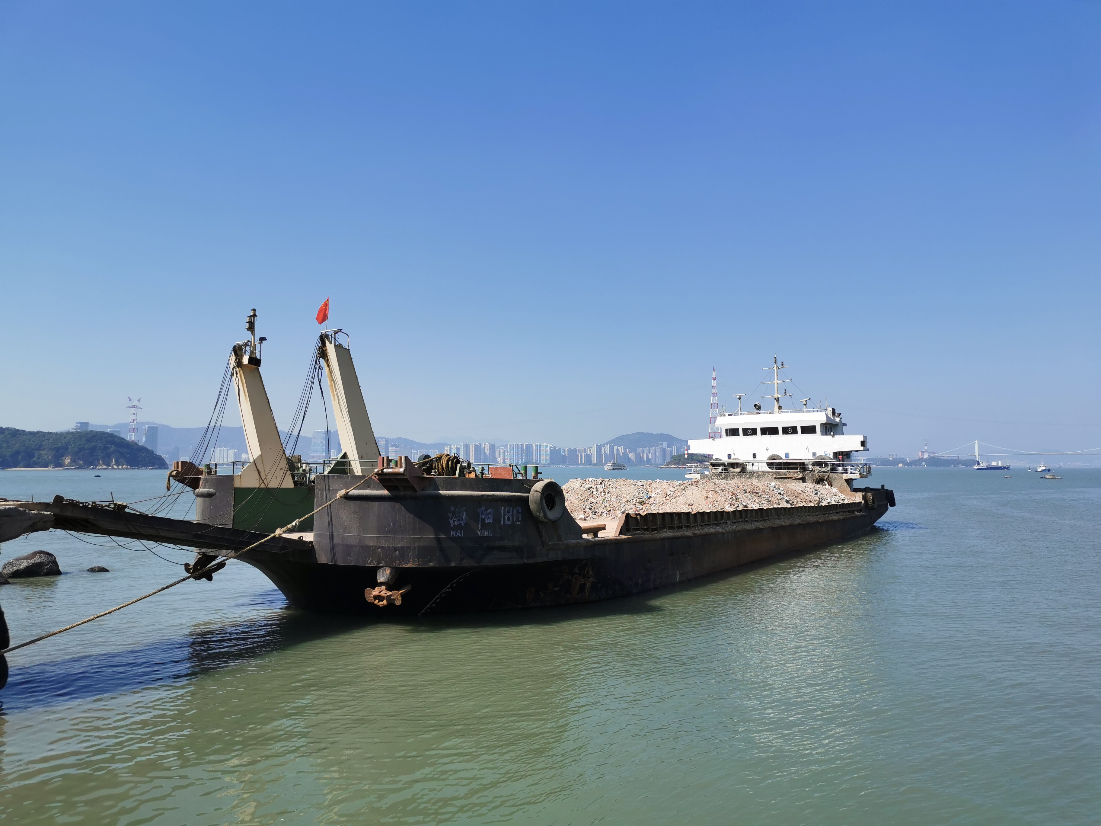 今日是工作日,码头上有许多装卸工人,船一到就有工头喊人去搬运。鼓浪屿应该没有建筑垃圾消化能力,所以码头上停着好多人力车,装满了建筑垃圾,等待装船运出岛。