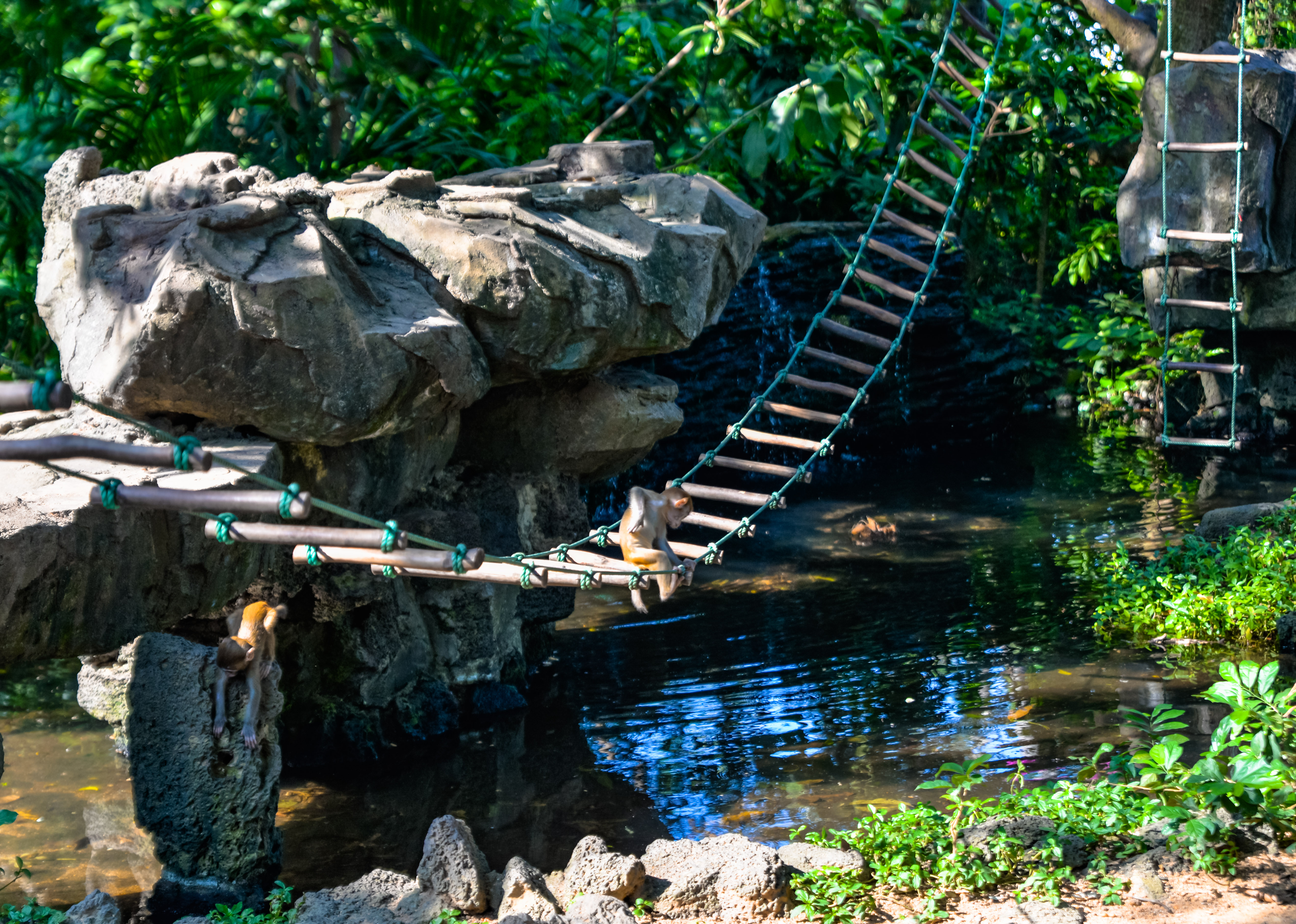 玩飞猴攀林是一次与猴子比敏捷的机会,走在各种路障绳索之间。但即使平常你是户外攀登的好手,遇见这群天生运动感爆棚的猴子们也是只能气的直跺脚。