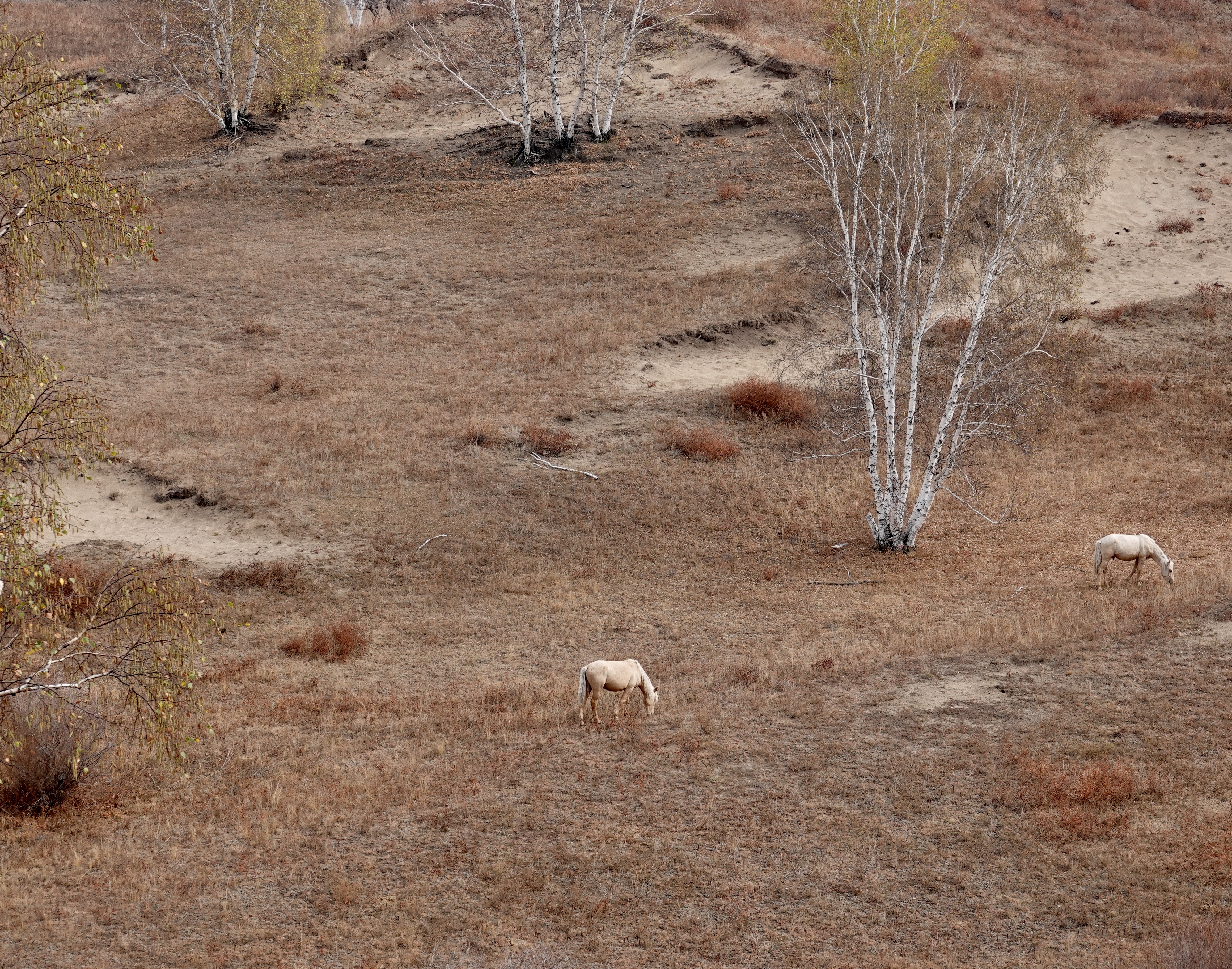时值深秋,浑善达克沙地笼罩在一片苍茫,深深浅浅的黄色之中,亭亭玉立的白桦树叶子已是落下大半,由于今年夏天雨水偏少,路过的河流水塘都干涸了。这里找一个沙坡,便可来一场免费的滑沙,同屋的小蜜蜂玩得不亦乐乎。这里大多数时候手机没有信号,有信号时手机上的地图也显示不出具体地址,只粗略地显示在克什克腾旗。