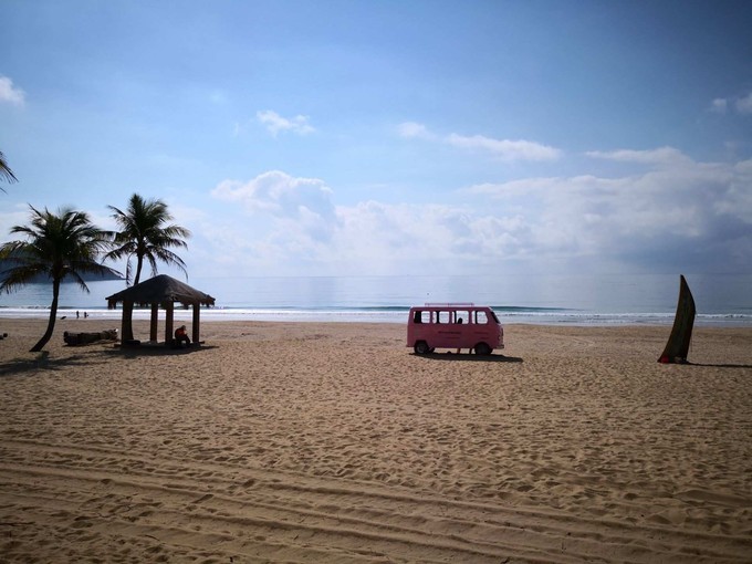 发现入住的酒店附近有一个很有名的网红打卡地,就是呆呆岛,由于景区开发较晚,海水很清澈,淡季的人也不是很多。(门票80元/人包含景区巴士门票)ins风的小粉车,小白车都是在那里,非常适合给女生拍照。也适合拍婚纱照。 陵水 动车站打车悦80元抵达景区。