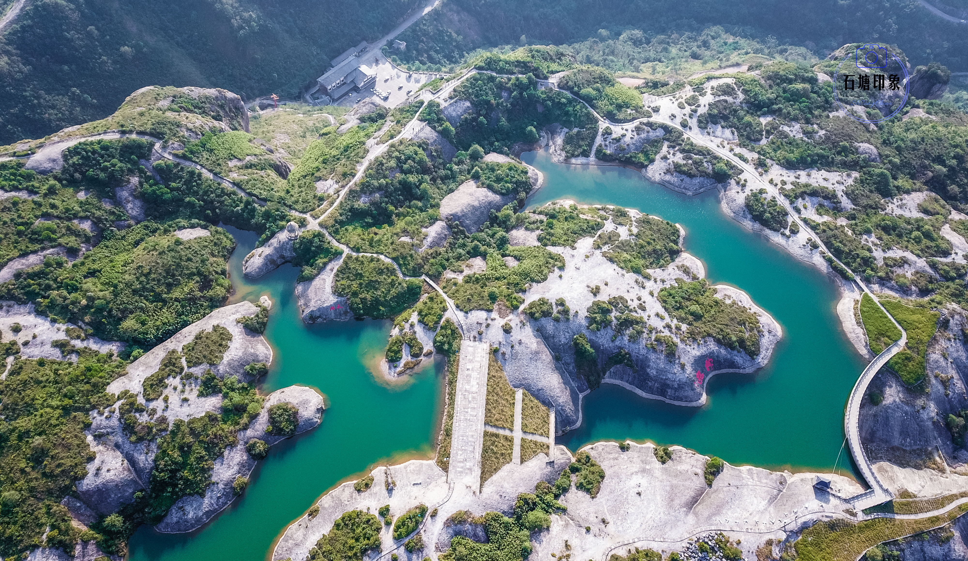 航拍视角带你看看观景台,两个圆形平台,突立在山腰上,平台均漆上白色,更增添了浪漫的气氛。