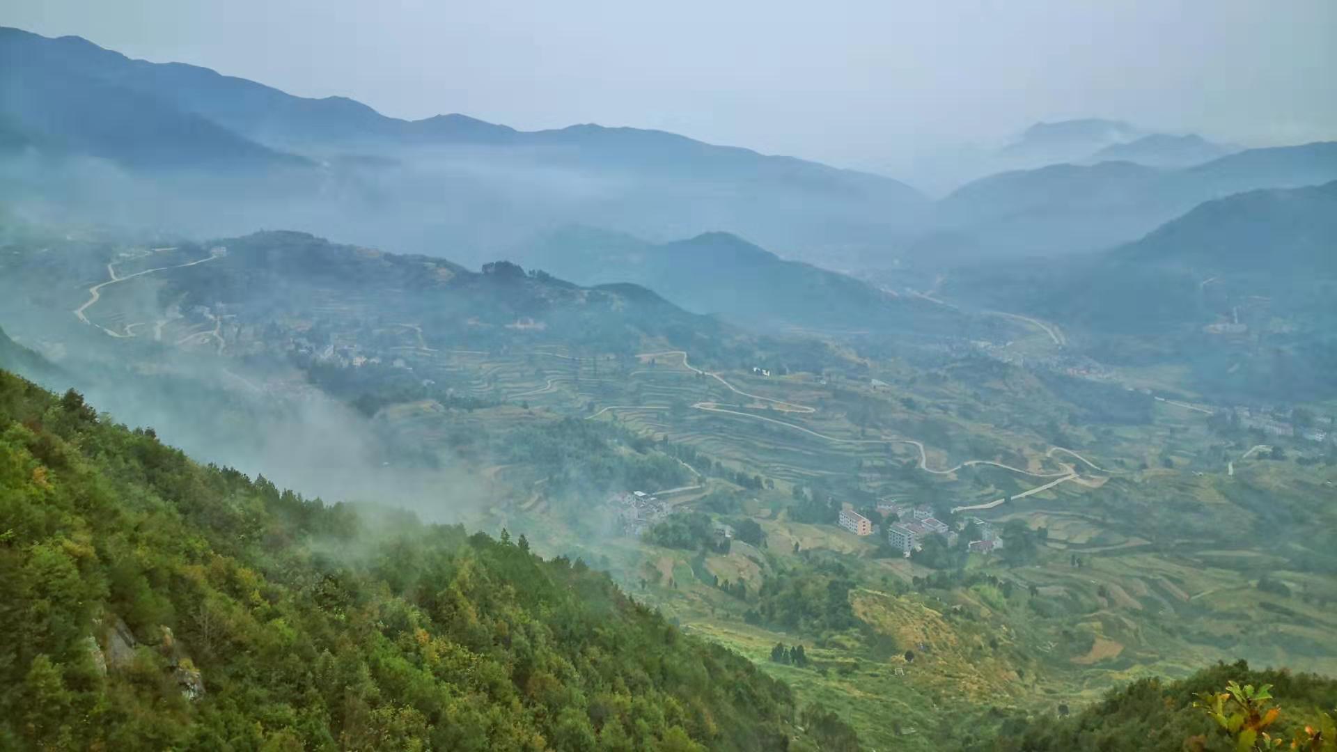 后半段的徐霞客古道,据传是当年徐霞客三上天台山的线路之一, 一路穿梭在古树林里的古道上, 偶尔冒出来的黄色野菊花, 小伙伴还抓到了一只螃蟹🦀, 叫着晚上给大家加餐, 喂喂喂, 你是认真的吗, 一人一根螃蟹腿都不够的呢.....经过两小时的爬坡 到了 , 天台宗的发源地,相传当年智者大师在此与 500罗汉说法, 并且因为海拔高, 此处可以俯瞰天台山,连绵不断的山脉......