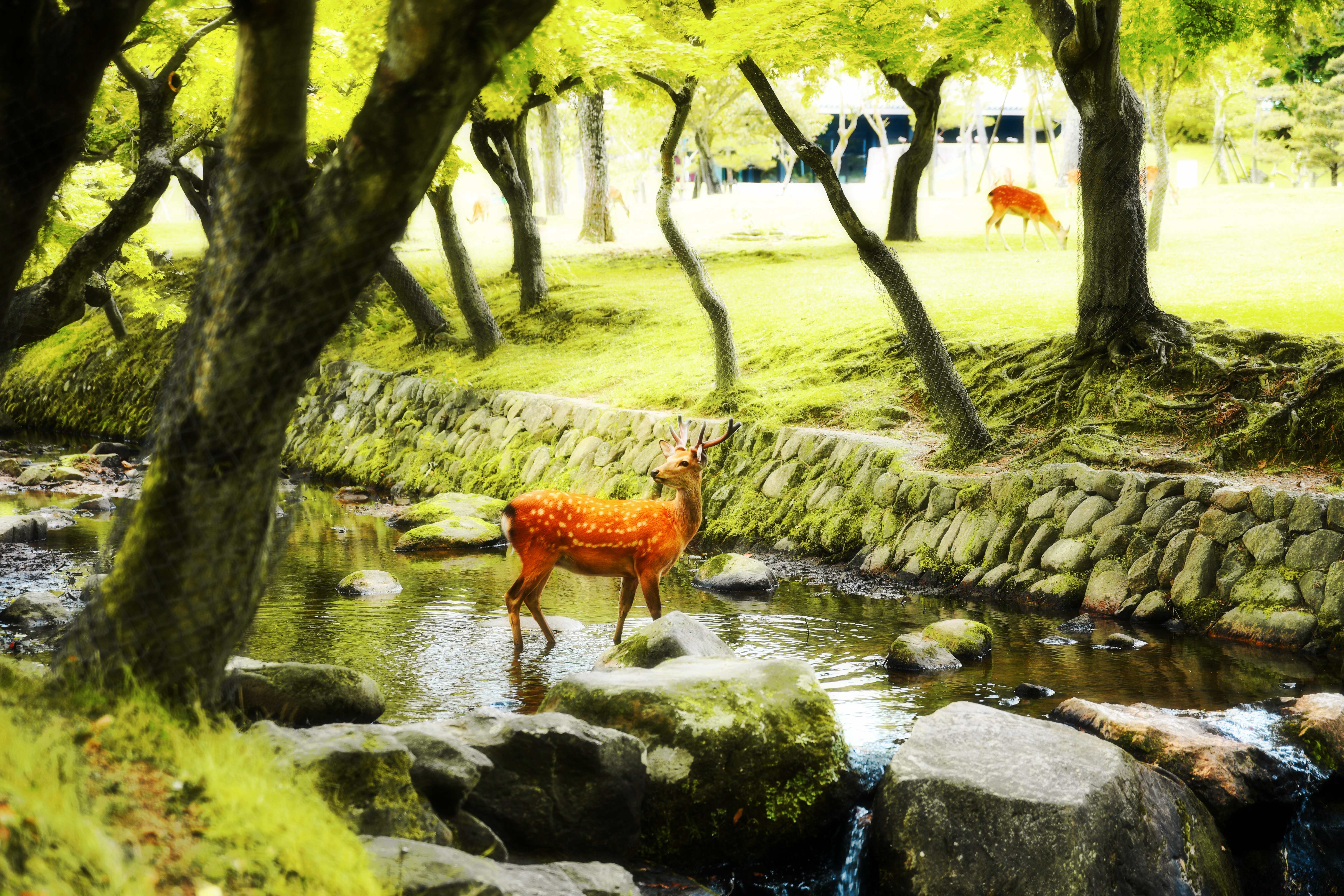 奈良以古朴的寺庙、宁静恬适的公园以及随处可见的梅花鹿为城市标志。按照唐朝长安城规制建设的〝平城京〞便在现在奈良市的西郊。成群结队的梅花鹿也是奈良最大的特色之一,在公园、神社、甚至是博物馆前、大马路边都能看见它们的身影。