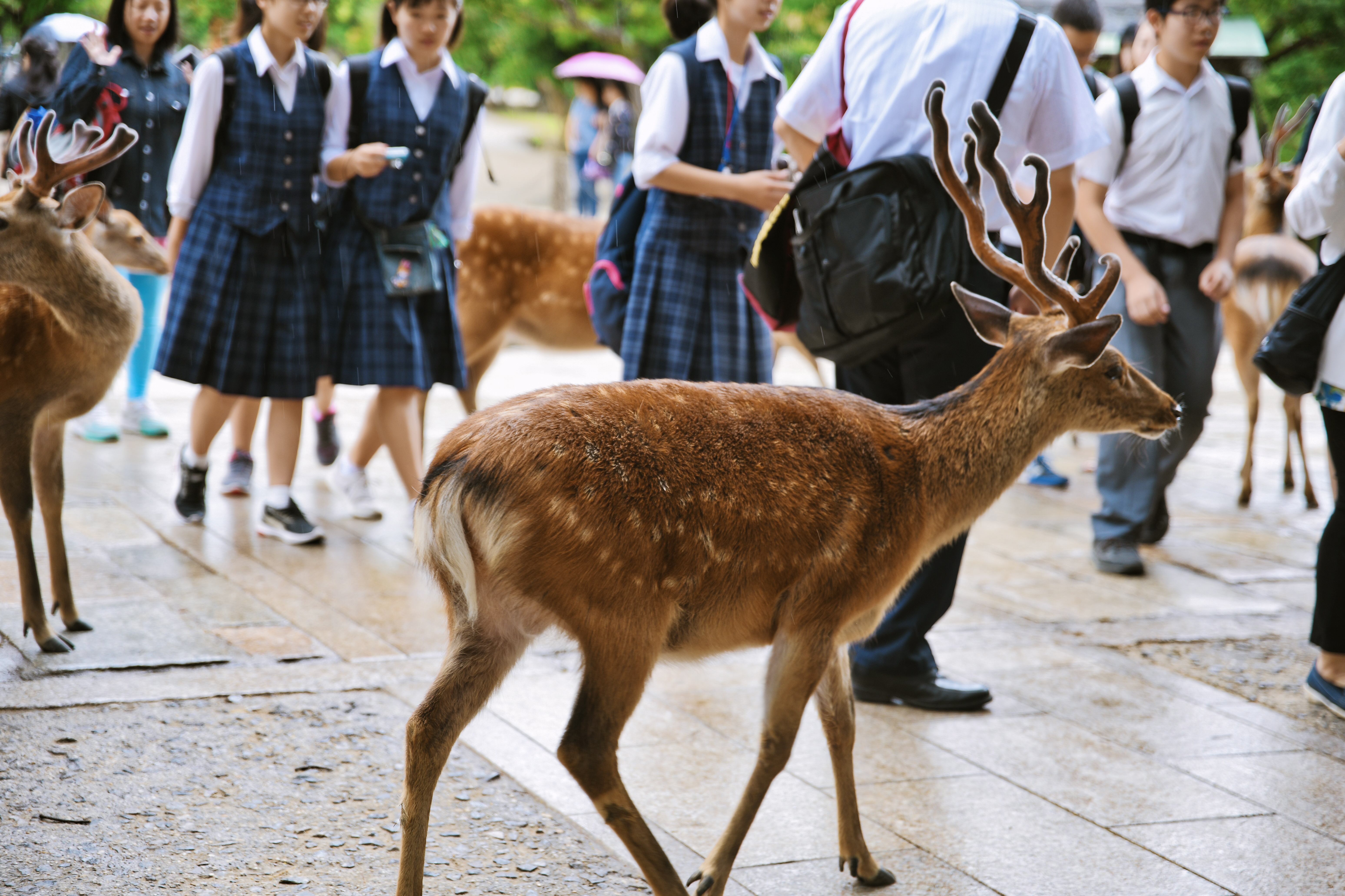一直耳闻奈良公园的梅花鹿(尤其是那些见多识广的社会鹿)非常凶悍,会咬人,所以早上一到了奈良公园,我并没有像大多游客一样在门口买“鹿饼”,而是赶紧先走到公园深处,才把鹿饼拿出来,小鹿们看到鹿饼自然就会成群结队的过来了。