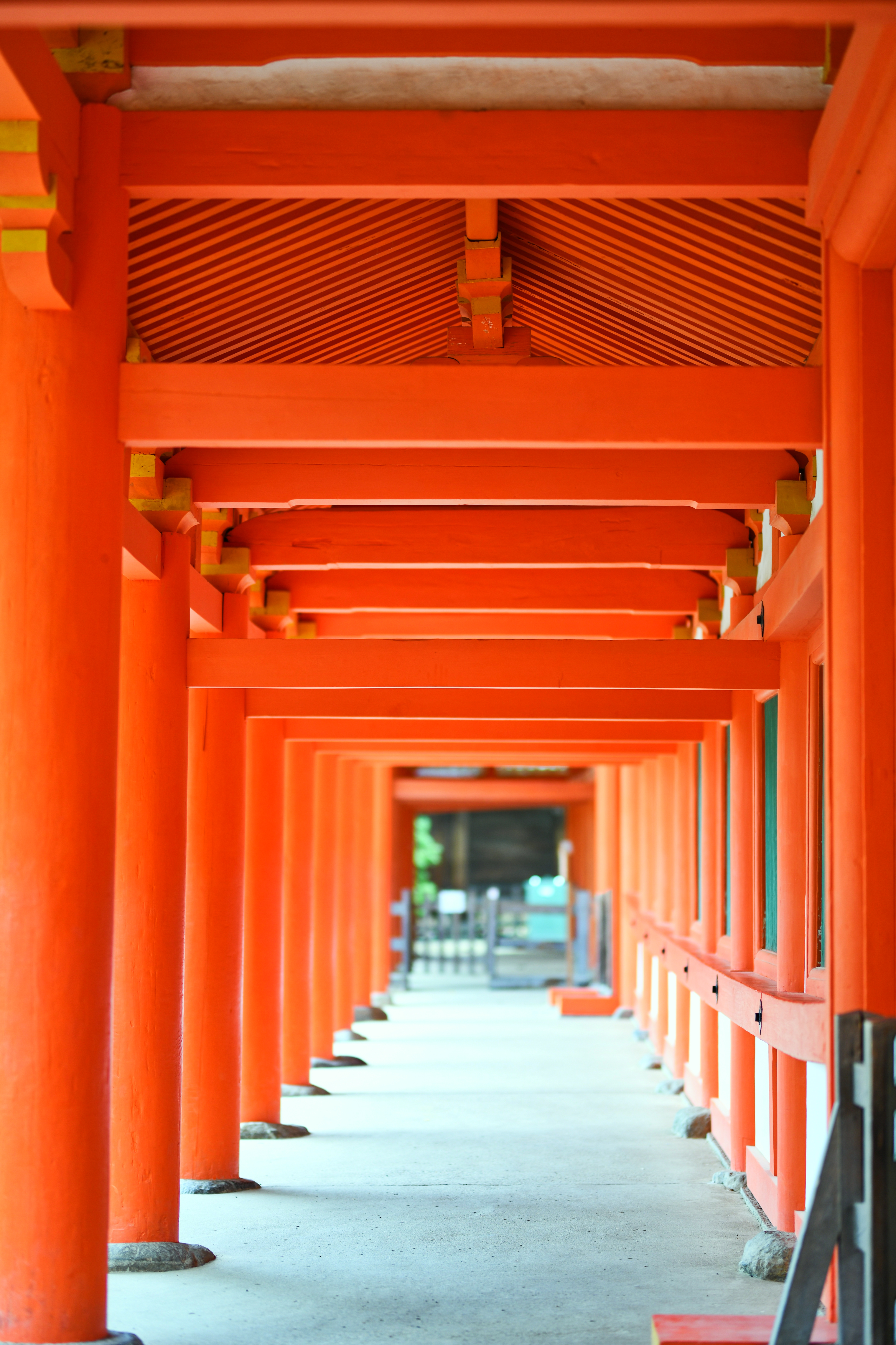 在如此浓郁绿色的环境下,春日大社恍然与世隔绝,人类的步伐像是突然闯入的探险者一样。围绕着神殿的朱红色回廊与夏日山麓的绿色丛林相映成辉,并与屋檐下的灯笼和林荫中的石灯构成了一幅绿野仙踪般的风景画。当我走在这里的时候,尽管身旁人来人往,刹那间却觉得这世界唯有这一社一鹿和一人。