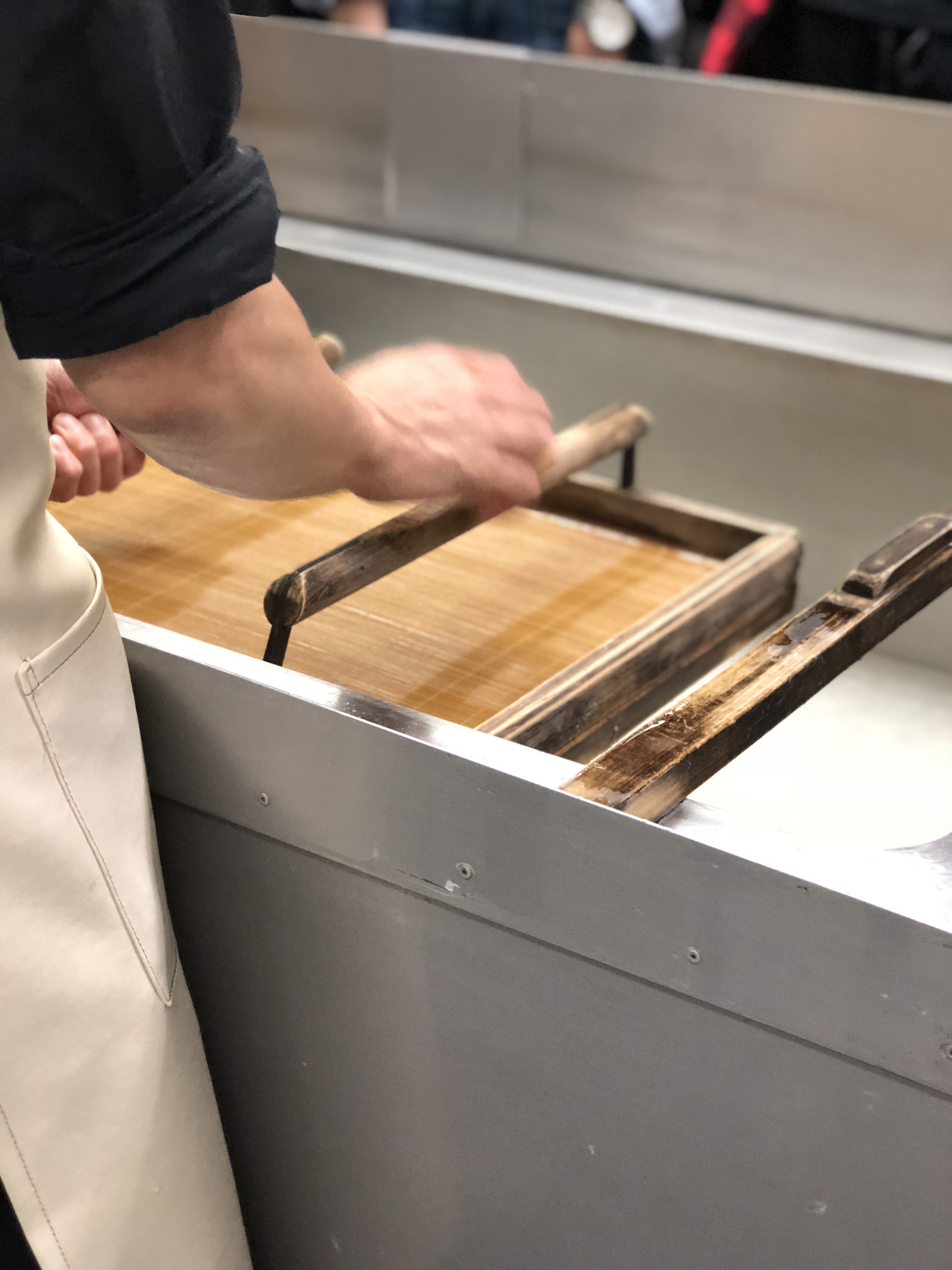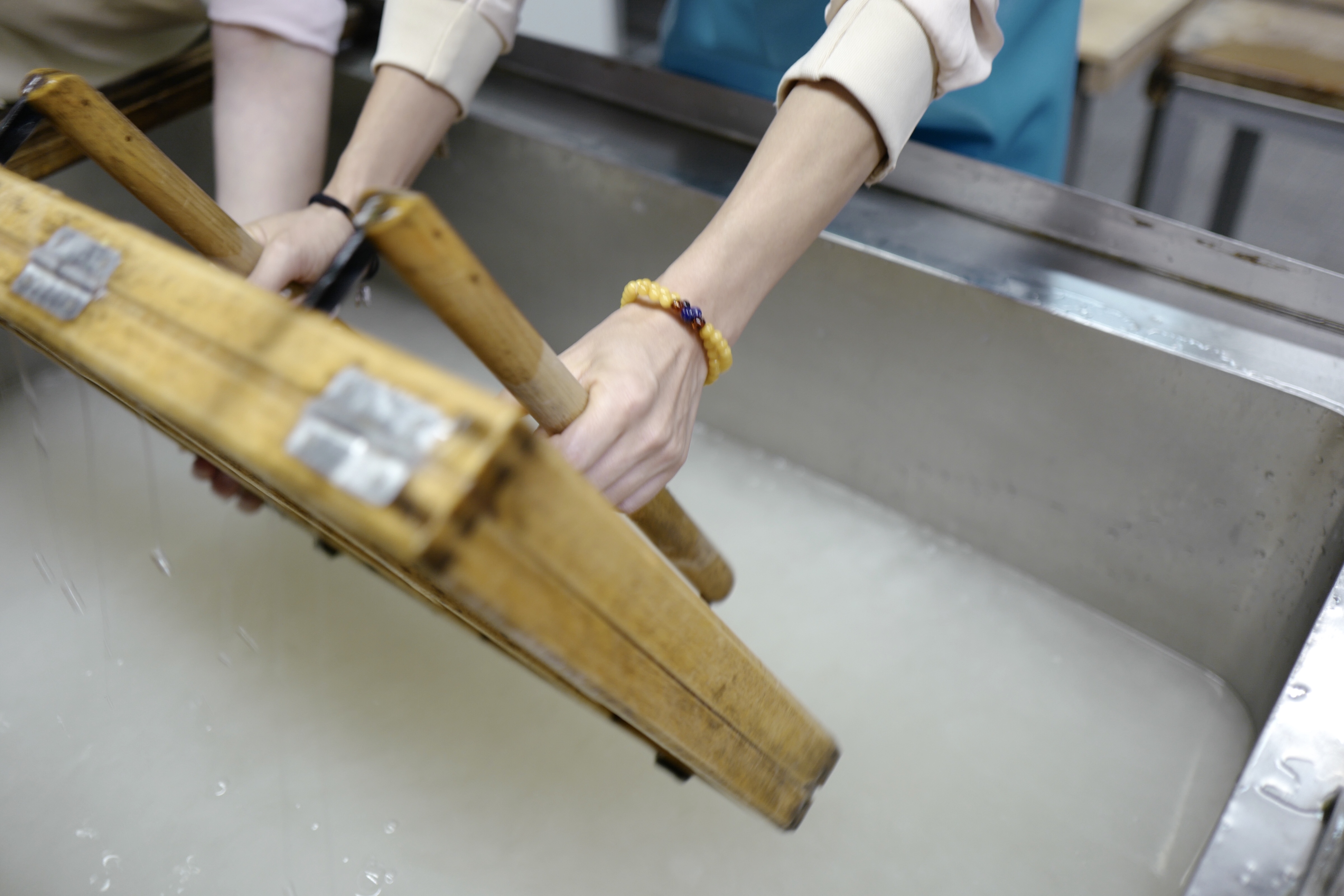 将横木架轻轻的放入滤缸中,掬取薄薄的一层纸浆,端出横木架,快速向外侧倒掉剩余的纸浆,这样,美浓和纸的原型积层就做好了。整个过程,手臂都要平稳有力。。。