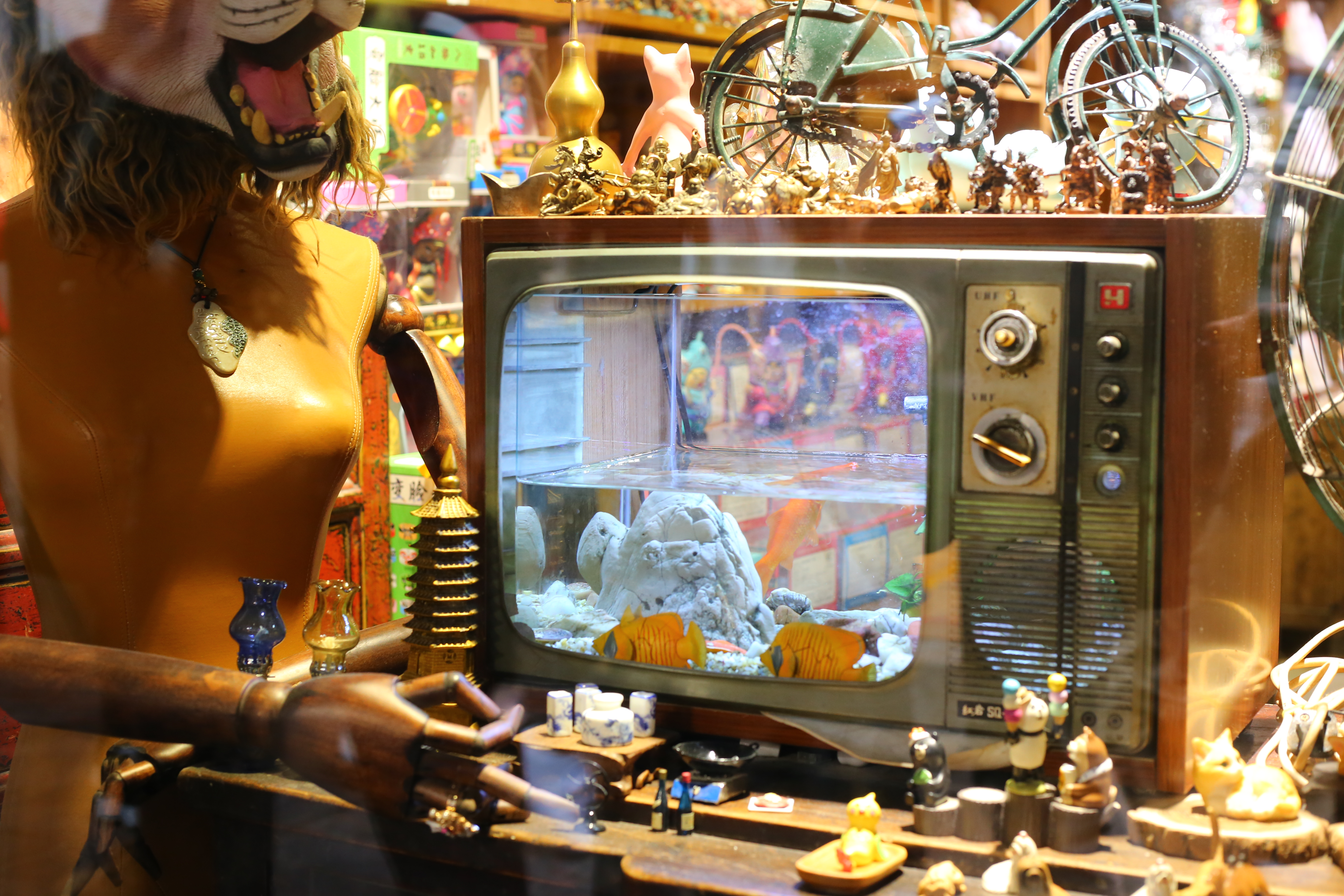 有着一段岁月的过往,总是要有一些老物件的陪伴,不知道有多少孩子们是见过这种老式电视机的,而如今老板也真的别出心裁,脑洞大开的改装成了鱼缸,佩服、佩服。