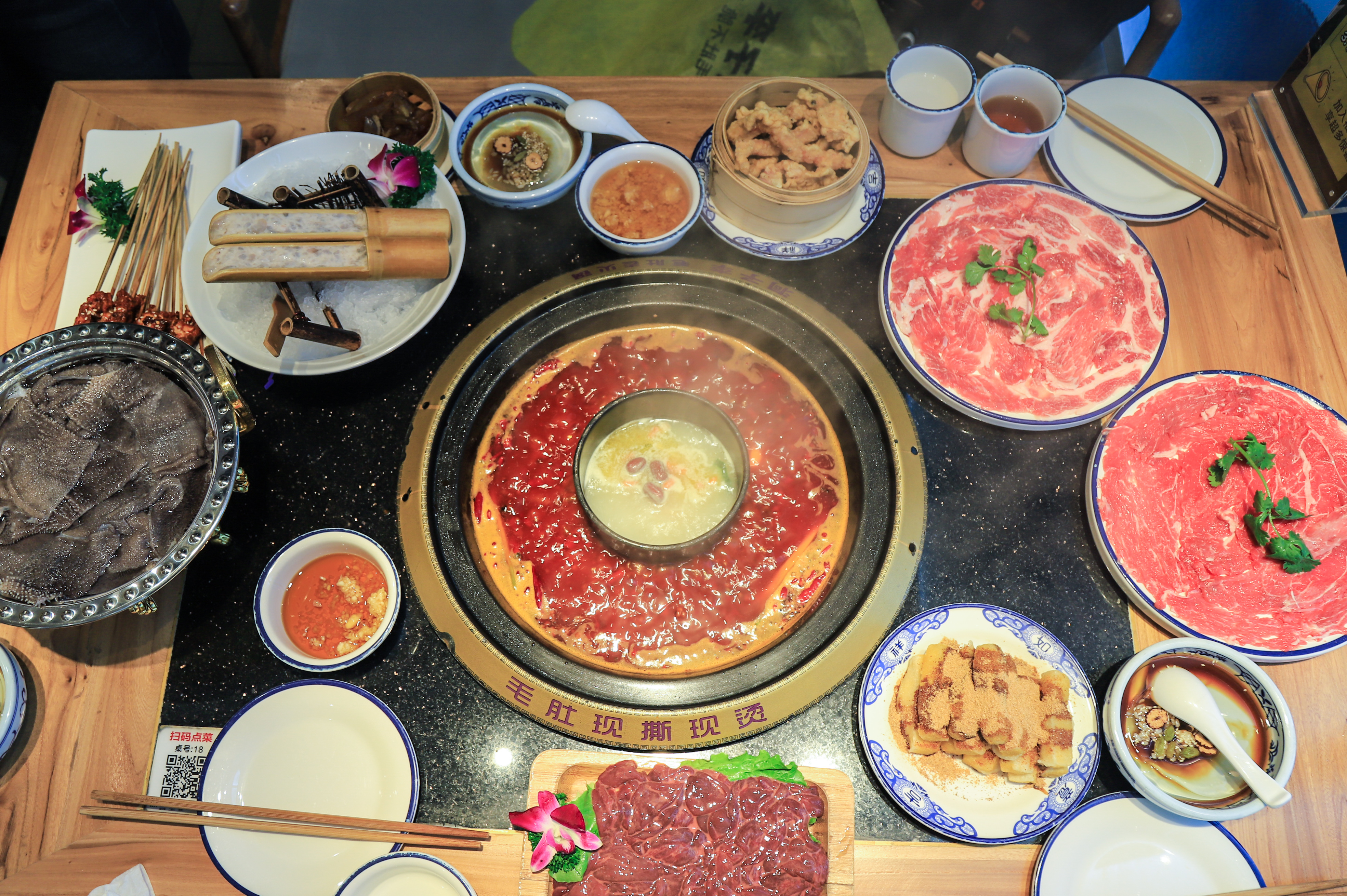 一进入餐厅就觉得这些都是免费的吗?请原谅我直接小声的问了出来,一旁的服务员说是的,只要不浪费,全部免费吃(我说的是图2哈),然后服务员还很热情的帮忙推荐,他们家除了毛肚是最大的特色外,还有鸭肠,喜欢的话可以尝试。小料也是完全自助的,在当地吃红油火锅自然是要吃最地道的油碟,但是商家也很贴心的防止了别的调味料,方便照顾不用的口味。