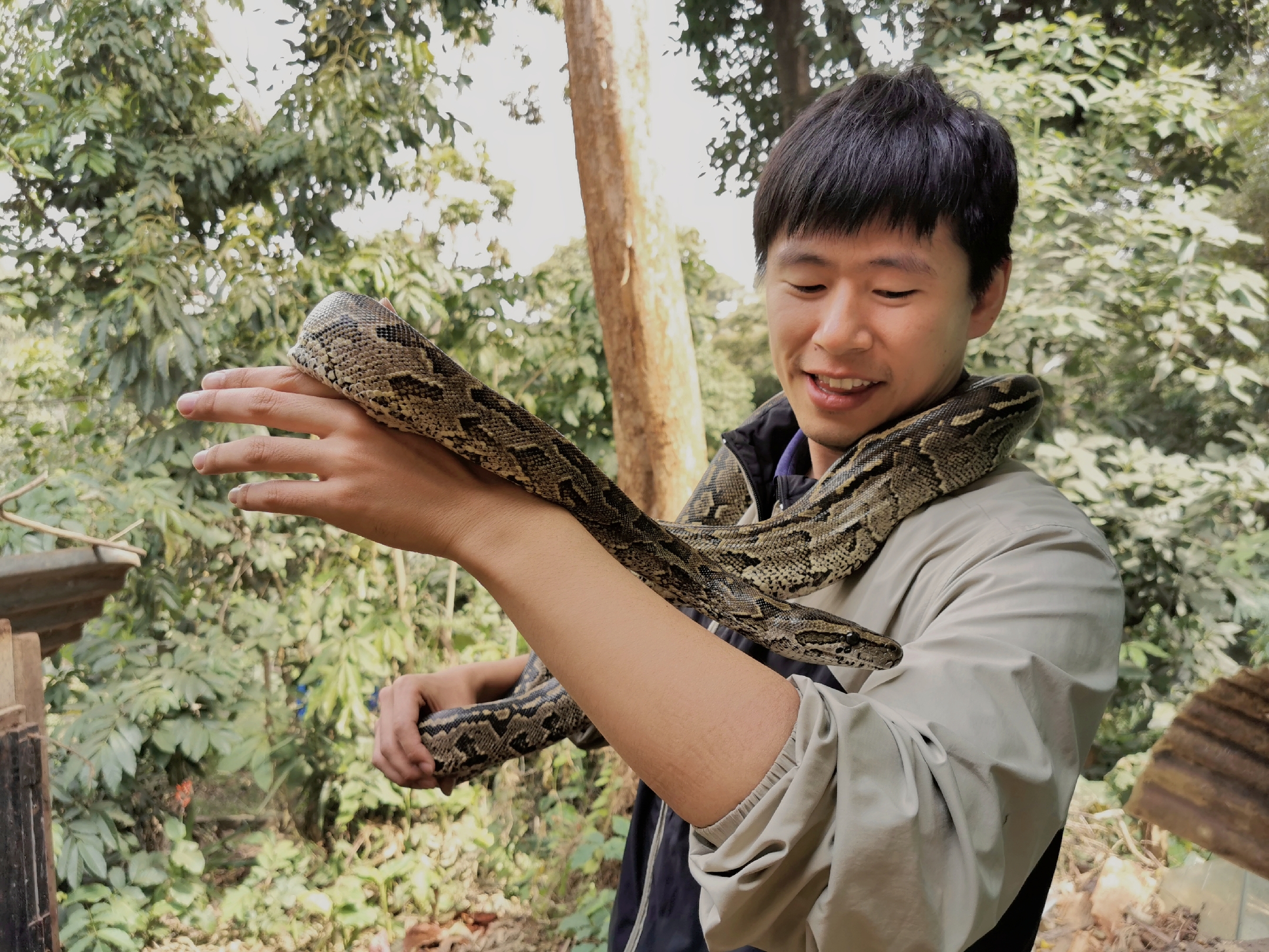 他领着我们进了一道铁门,一群中学生正在外面参观蛇,我们就这样走了进来。只见他顺手就从参观的玻璃房里掏出一条,“不用钱,给小费就行!”吓得门口的中学生“哇哇”地跑出老远。