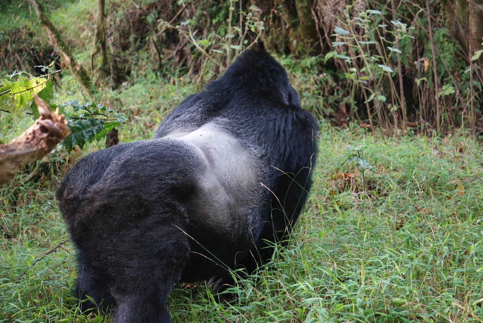 大猩猩们会来回走动地找新鲜树叶吃,山地对他们来说如履平地。而我们呢,眼睁睁地看他们优哉游哉地挪了那么几步路,却死活也走不过去。要么四手四脚地艰难爬过荆棘、要么不得不在密林中绕路飞奔——不追着他们的屁股跑,是别想在枝繁叶茂的丛林中看清他们的。