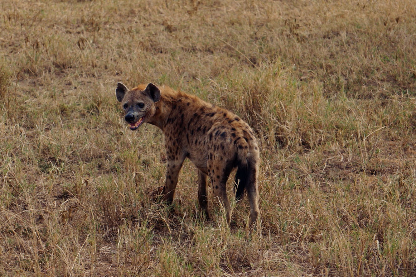 我们开车跟着第三只鬣狗走了好久,他叼着这根宝贝骨头一路跑,一直跑到草丛里独自享用。我们就听着从草丛里传来的咬碎骨头的“咔咔”声,长焦镜头一拉,发现它啃骨头啃得唾沫横飞。咬了一会儿,觉得不放心,又叼着宝贝骨头跑了好久……
