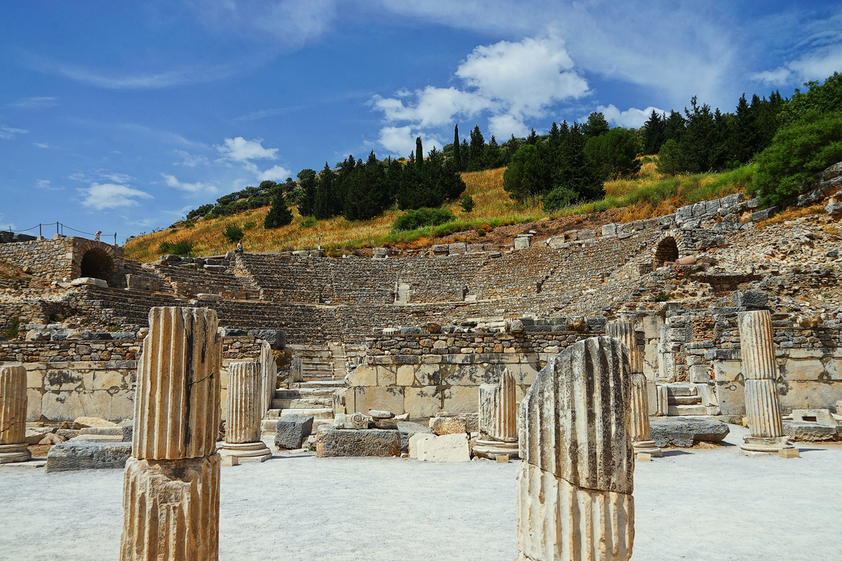 《以弗所大剧院》:是由 希腊 时期的利西马科斯国王首建, 由 罗马 人从公元41年到117年间改造而成的一座环形大剧院。依山而建,面向大海,坐席可容纳 2.5万人。 大剧场从舞台开始,每一排都比前一排更加倾斜陡峭,改善了上层外围观众的视听效果。后来在 罗马 帝国时代加以扩建,是“五贤帝”之一的 图拉 真大帝亲自督建的。今天看到的大剧场就是 罗马 人扩建后的模样。共有66排座位,呈直径154米高38米的半圆锥形,气势恢弘。现在每年5月的以弗所文化艺术节都在这里举行。