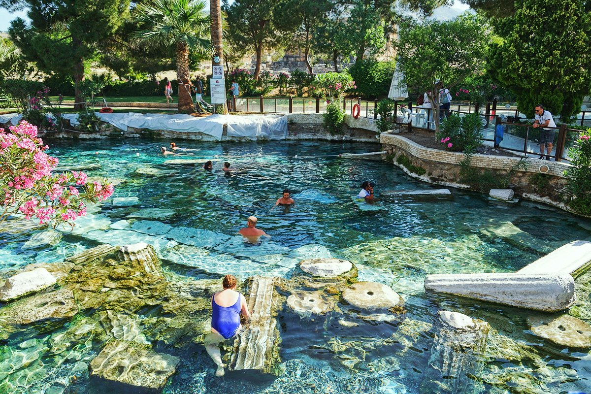 作为两千年前的 希腊 时代的温泉疗养胜地,传说 埃及艳后曾经在这里泡过温泉,第一个到这里泡温泉的人是拜占庭帝国的伊琳娜女皇。当我们走进温泉疗养地,惊奇的看见这个古浴场-----依然是泉水碧绿,四周花团锦簇,温泉池底竟然还有七世纪地震时崩塌的古 希腊 廊柱,可以想见七世纪时期这里的温泉泡池该有多么的舒适与华丽啊!! ·