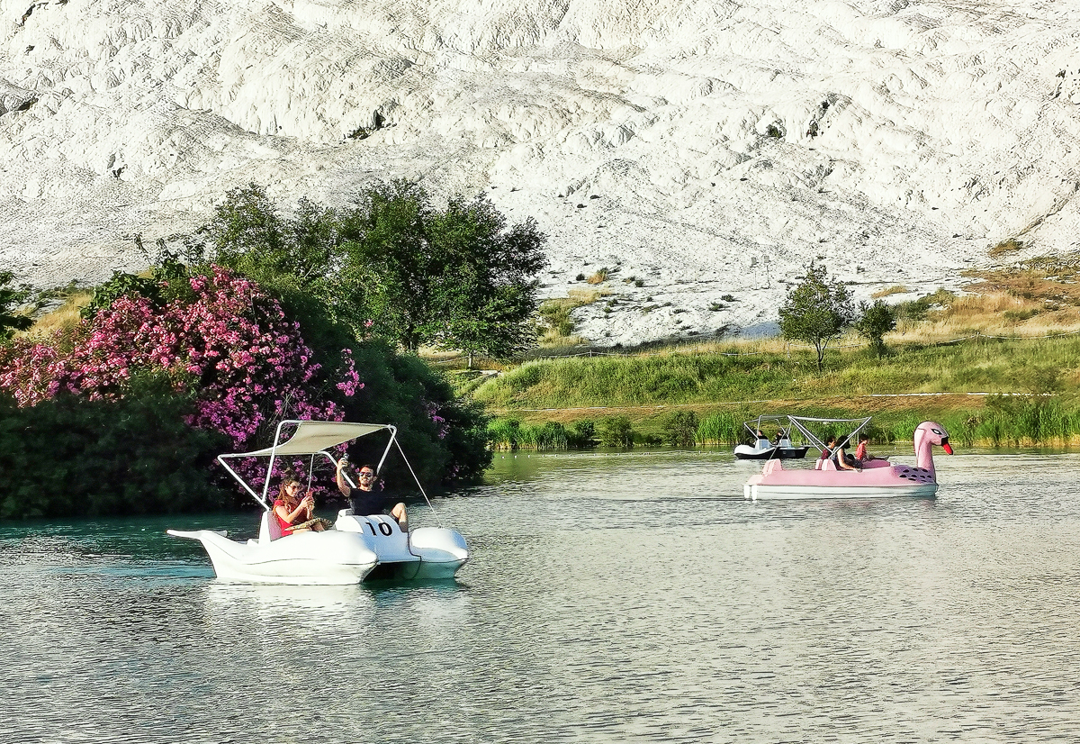 雪白的 棉花堡 山坡下这是无需门票的野鸭湖公园(或 棉花堡 自然公园)。我们看见:棉花山的温泉水流经几百米山坡,在这里聚集为一弯清澈见底的小湖。碧波中鱼翔浅底,野鸭戏水;岸边垂柳轻拂,红花齐放。好一幅人间仙境世外 桃源 的画卷啊。引得不少各国游客在这里投食戏鸭或划船摄影啦。