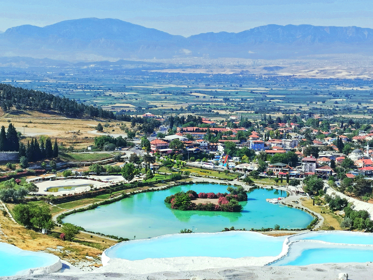 离开野鸭湖公园,我们来到上面大家熟悉的 棉花堡 所在地,一层层白色的钙 华池 上流淌着温暖的泉水,下方就是刚才的野鸭湖,景色如此优美,吸引着世界各地的旅行者,大家都喜欢在 棉花堡 消磨时光。