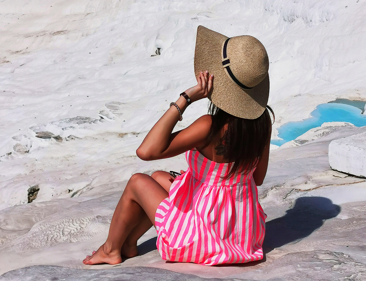 10月的 棉花堡 温度虽然不算高,但是紫外线非常强烈,掉以轻心的我们晒黑如同 非洲 人啦。看人家是擦防晒油,戴黑墨镜,有准备的拍! 所以尽量上午早点过去,同时也能避免游客过多,影响体验和拍照。