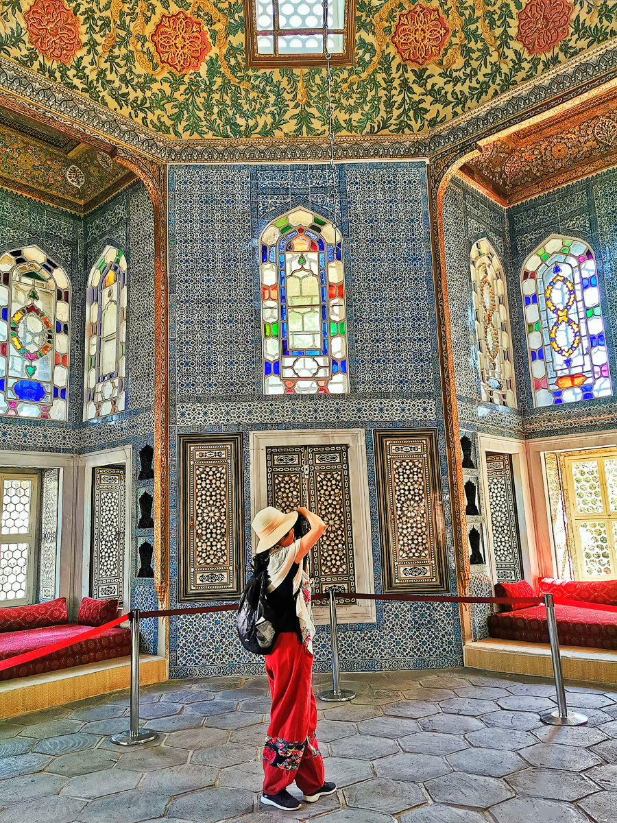 然后,我们一边沿原路返回,一边观赏庭院的景色,进多个展厅参观。整个宫殿设有御膳房、寐室、花园、图书馆、学校及清真寺。还有各种艺术家和工匠,为整个帝国制作了许多优秀的作品。在第三庭院,观赏了圣物室(里面不准拍照)。在开放参观的部分展示了大量的瓷器、武器、画作、书法原稿及珠宝宝物等。这是镶满宝石的地毯。