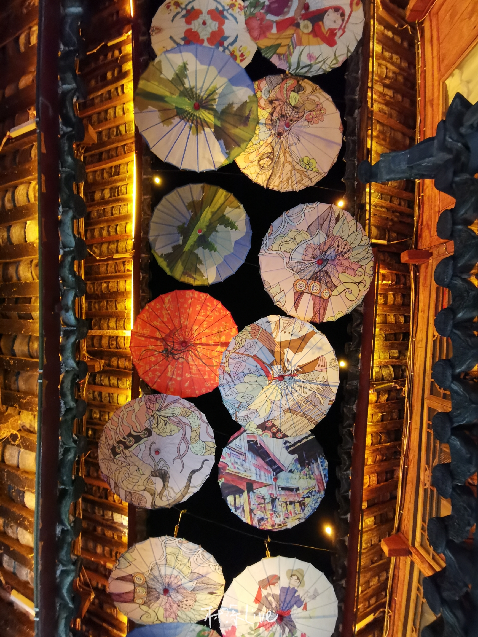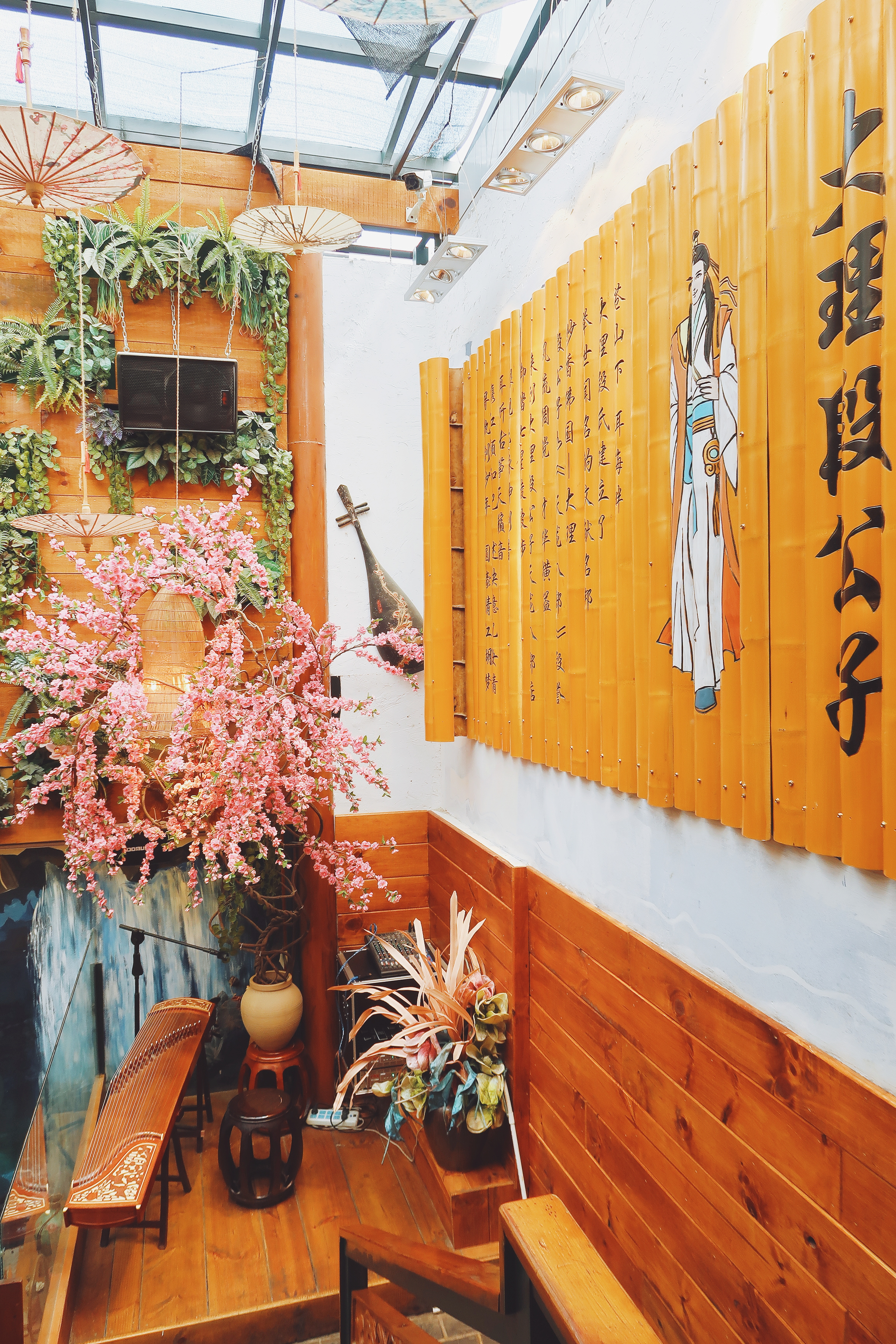 桃花灼灼,彩色的雨伞挂满屋顶,扶梯转角处,一幅壁画、一张琴、一壶浊酒,饮尽千年。