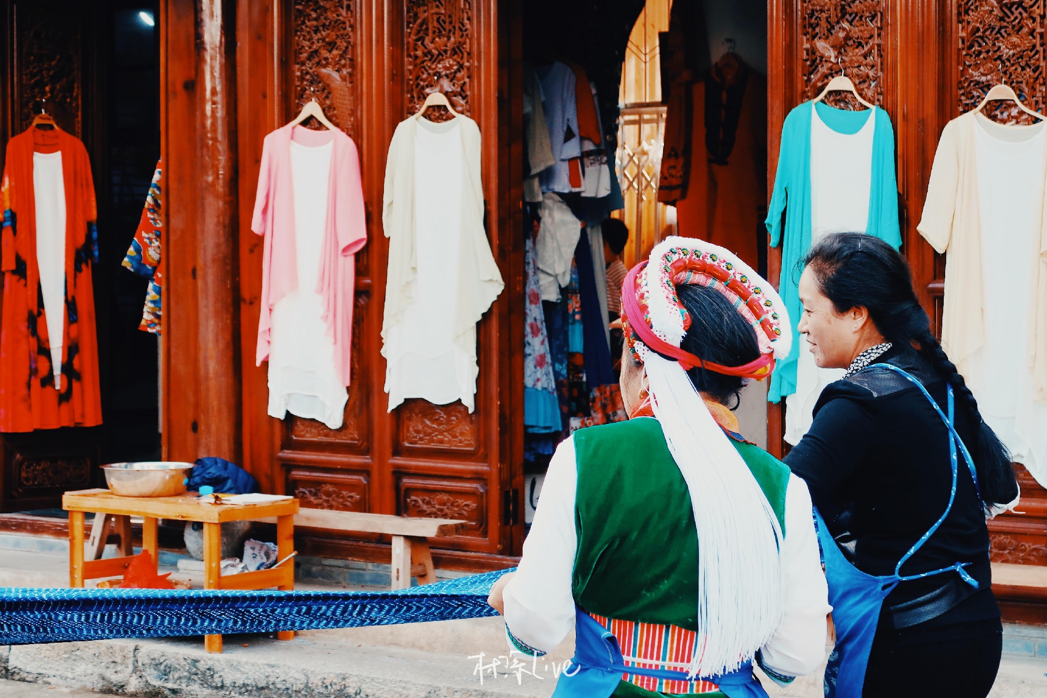 我们走进了一家扎染店进行参观,身着白族服饰的老奶奶很热情,说里面还有,可以进去看看。