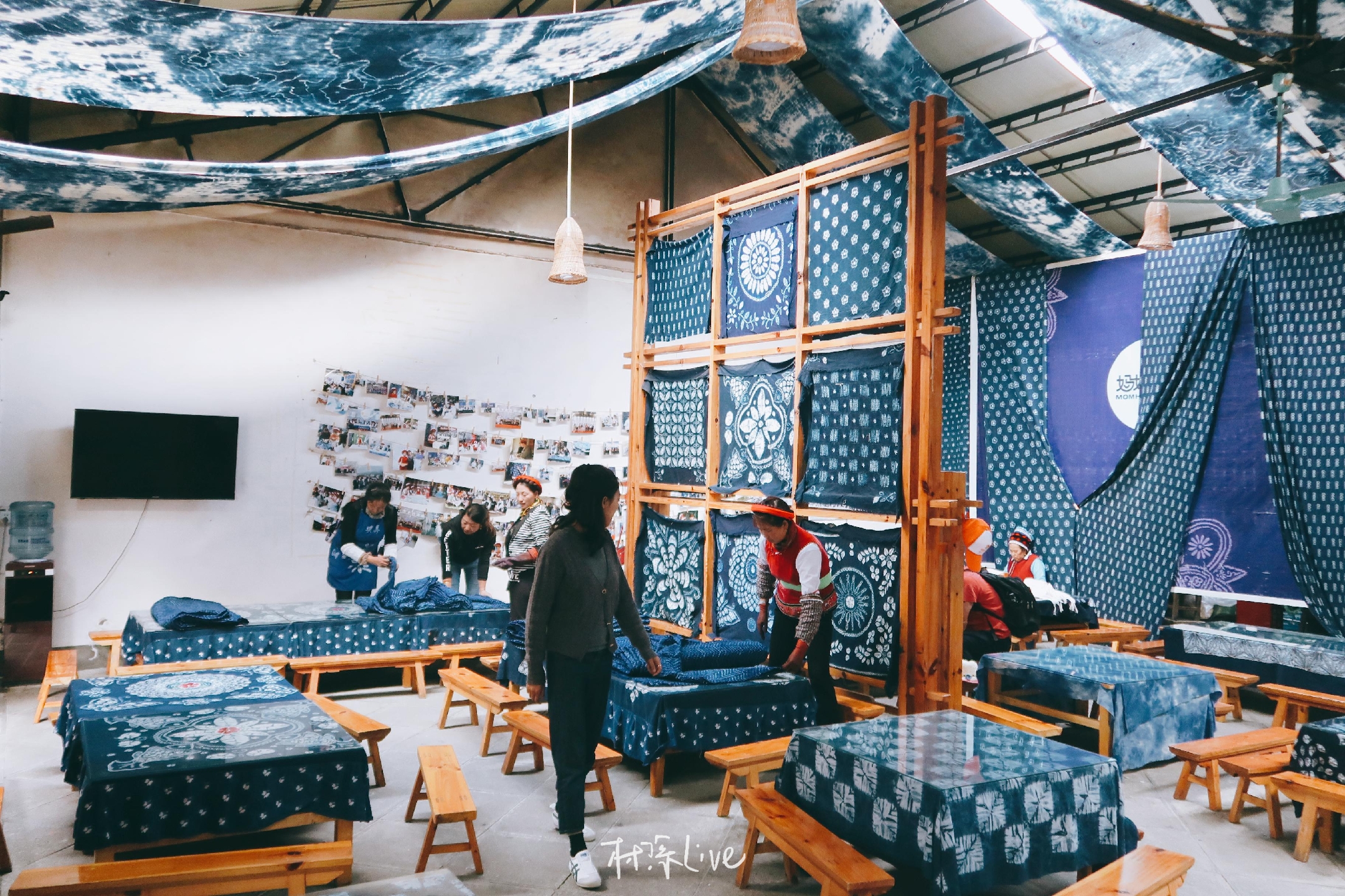 走进周城,扎染挂满了路边的墙头,蓝白色渲染的墙面,房屋因扎染而焕发出独特的气质。