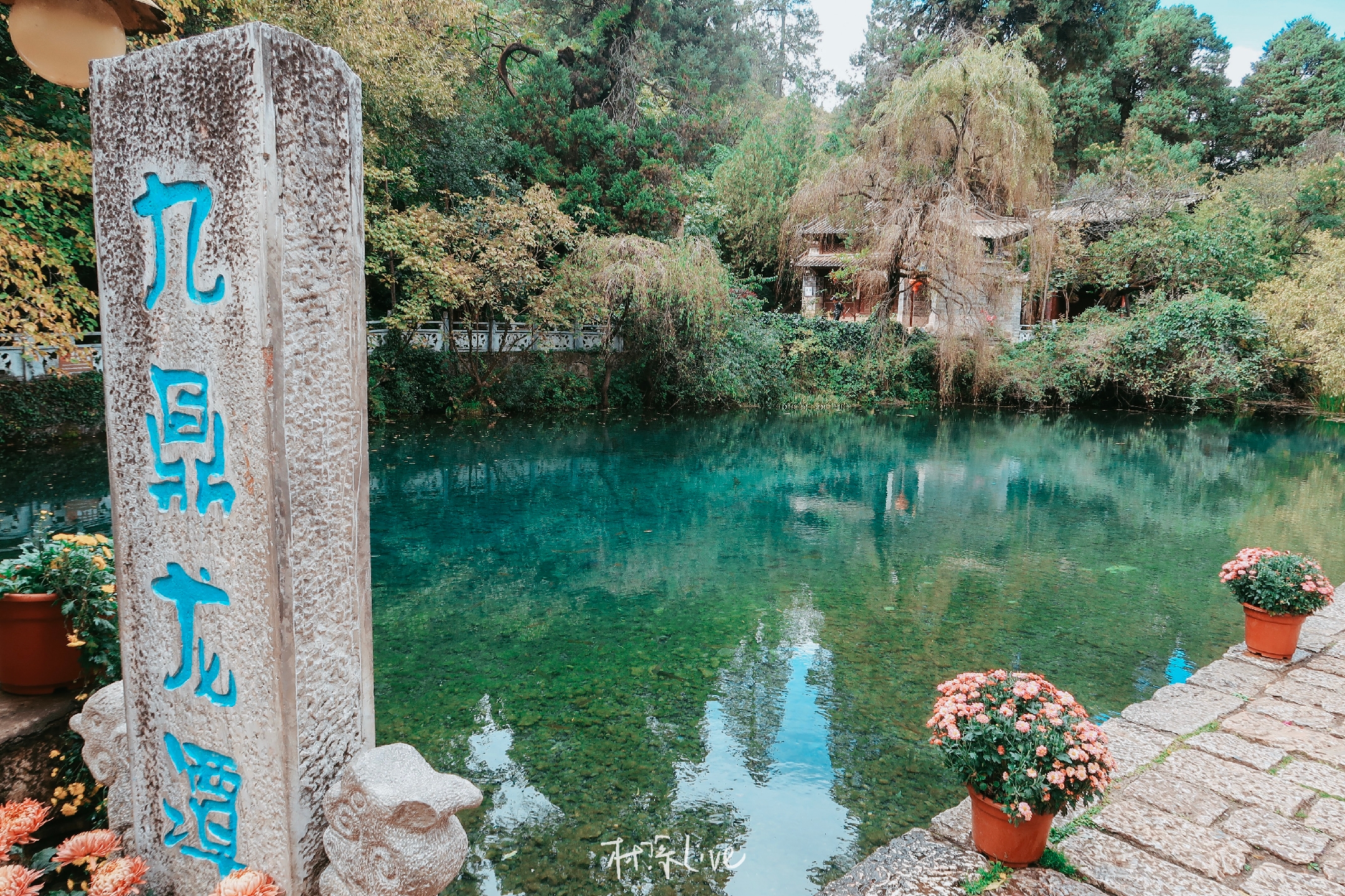 在古镇的北边,有个颜色很好看的潭水——九鼎龙潭。