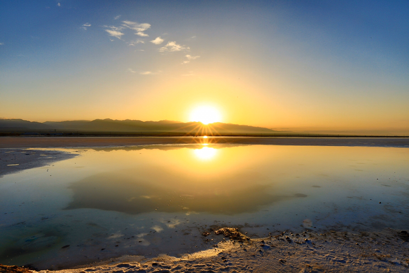· 盐湖岸边结着大块的盐花。据说连我们脚下的路都是盐铺成的,比沙子还好用。