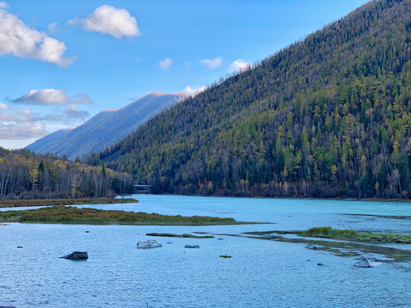 早上从白哈巴坐景交车前往喀纳斯的时候,一路遇到了小雨、雨夹雪,非常担心上不了观鱼台,谁知一阵清风吹散了乌云,也吹散了我们的担忧,当在喀纳斯湖边看到碧蓝的天空时,忍不住惊呼,看,放晴啦,观鱼台露出来了。
