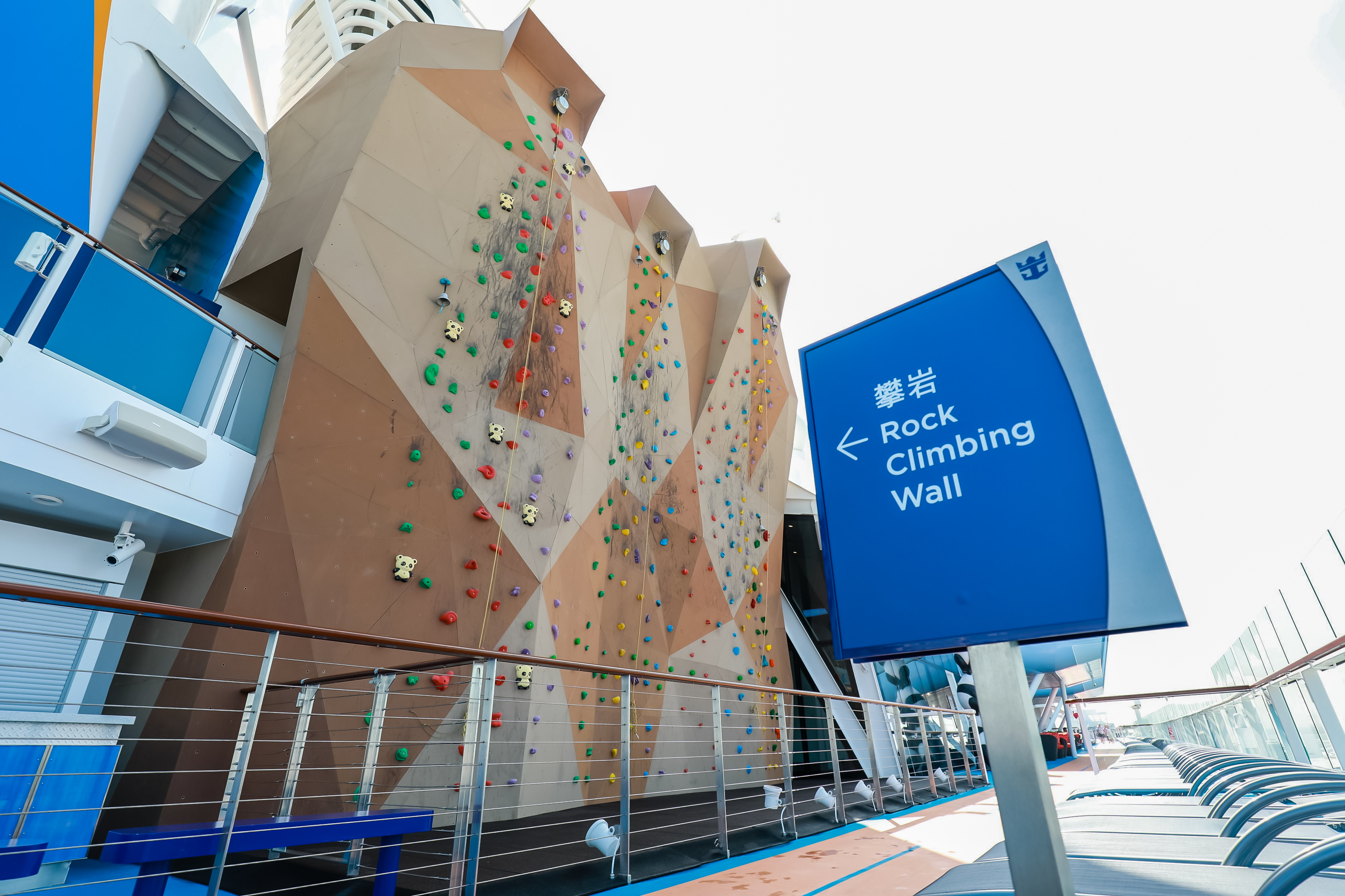登上甲板,可以看到很多海洋量子号经典的项目,也瞬间便能发现海洋光谱号独特的新元素。最让人惊喜的就是光谱号将量子号上玫红色的巨熊雕塑换成了黑白配的滚滚!这样的元素既中国又呆萌。滚滚当道,认谁都抵挡不住国宝的诱惑,趁着没人,赶紧掏出手机啪啪啪。