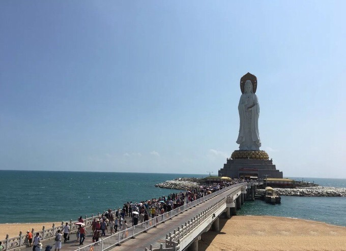 入口到海上观音站乘坐观光车差不多几分钟,大老远的就能看到巨大的观音像。其实当你乘坐飞机来到三亚 的时候,如果飞机飞行的角度好,你直接在飞机上就可以俯视到这座观音像
