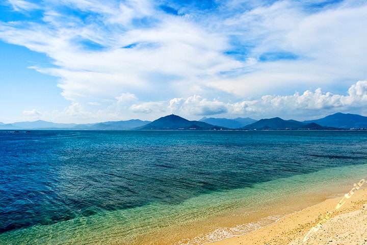 沙滩坡缓,海水由浅而深,在海湾的怀抱里,击浪于碧波之间,浮沉于银浪之上,令人身心舒畅。
