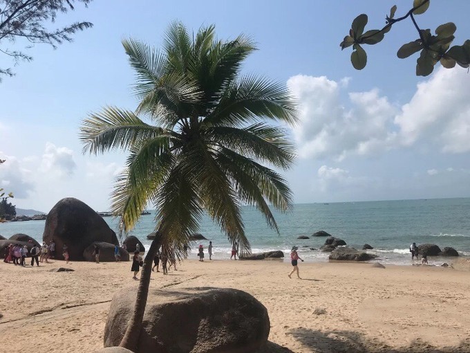 高约7米雄峙于大海的圆锥形巨石“南天一柱”,“南天一柱”这四个大字是清代宣统元年(1909)崖州知州范云梯题刻,以前的两元人民币背面图里印着的就是这块巨石。