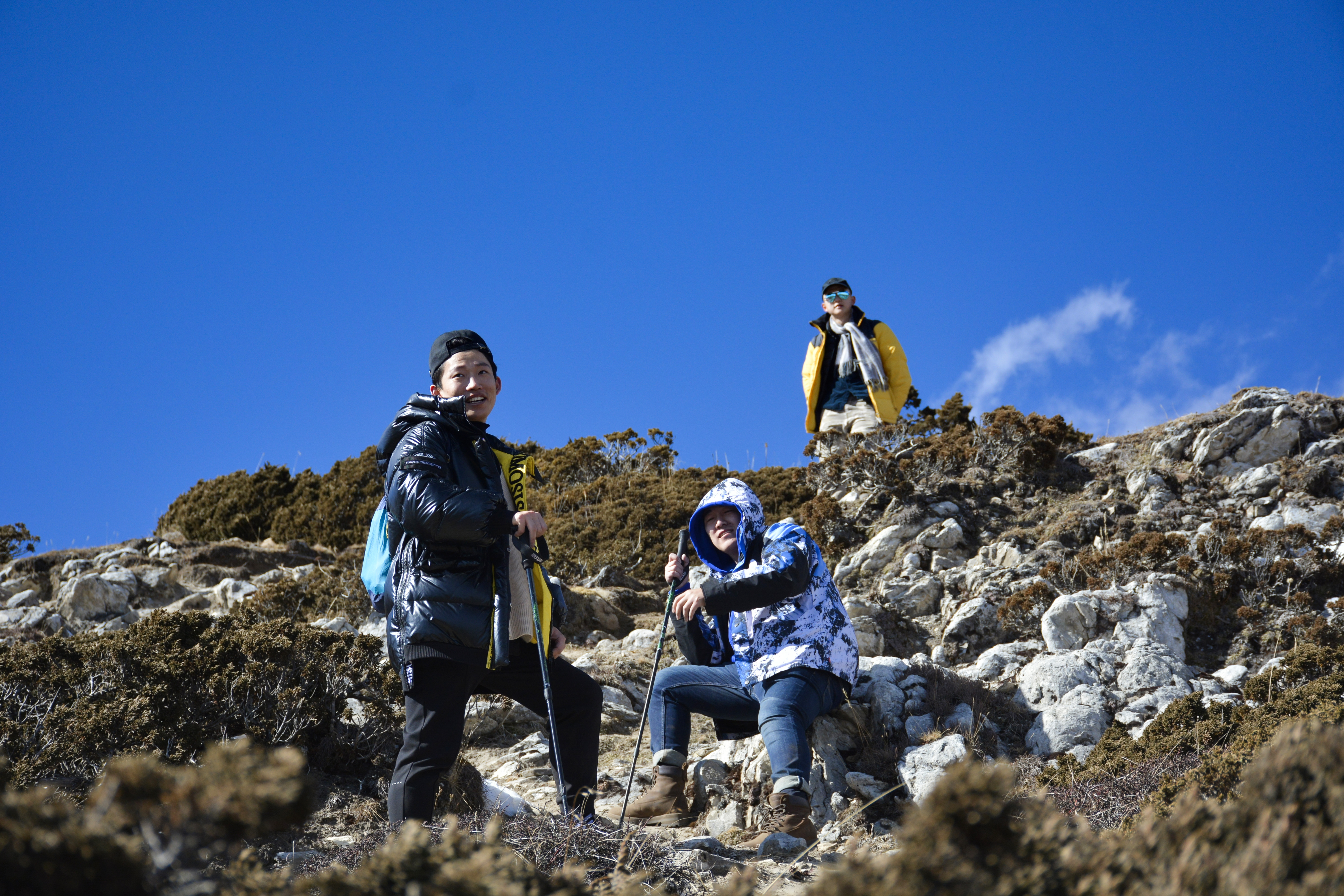 由于山顶的风太大吹着太冷,一批游侠决定先行徒步下山,另一批游侠则是在山顶守候“日照金山”。
