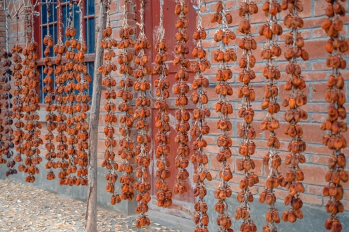 村内有一处宅子,门口的玉米串有一人宽,从房檐挂到地面,宅子的主人是一对老夫妻,瞧见了我们,欢欢喜喜地端出一大盘自家晾晒的柿饼,一个又一个地塞到我们手里,还一边说着“自家的,可甜了”。