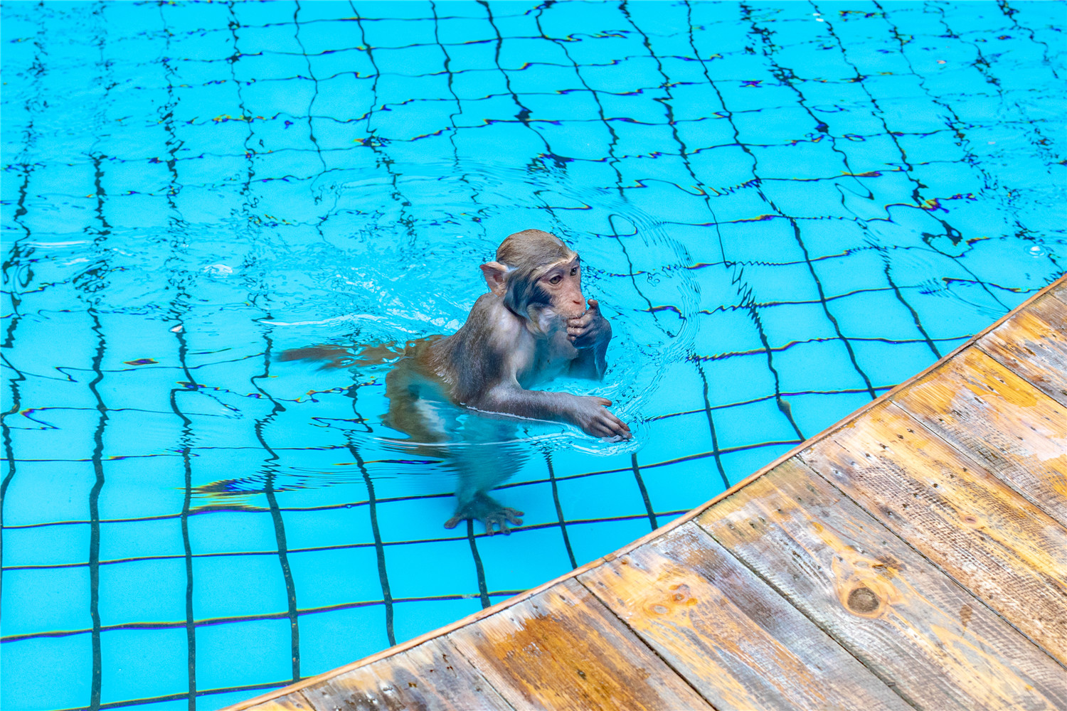 紧接着,我们来到了浴圣池,这里是猴子的水上乐园,更是猴子们不可多得的纳凉之处,海南夏日炎热,这五星级游泳池的建立,对于猕猴们来说,绝对是天大的福音,看到这里,我不禁大赞景区的用心,时刻将猕猴放在第一位置,将“主人”地位诠释得淋漓尽致。这些猴子大多训练有素,只要一听到哨声,便会纵身一跃,迅速跳入泳池,潜水、游泳、高楼跳水等各种动作运用自如。