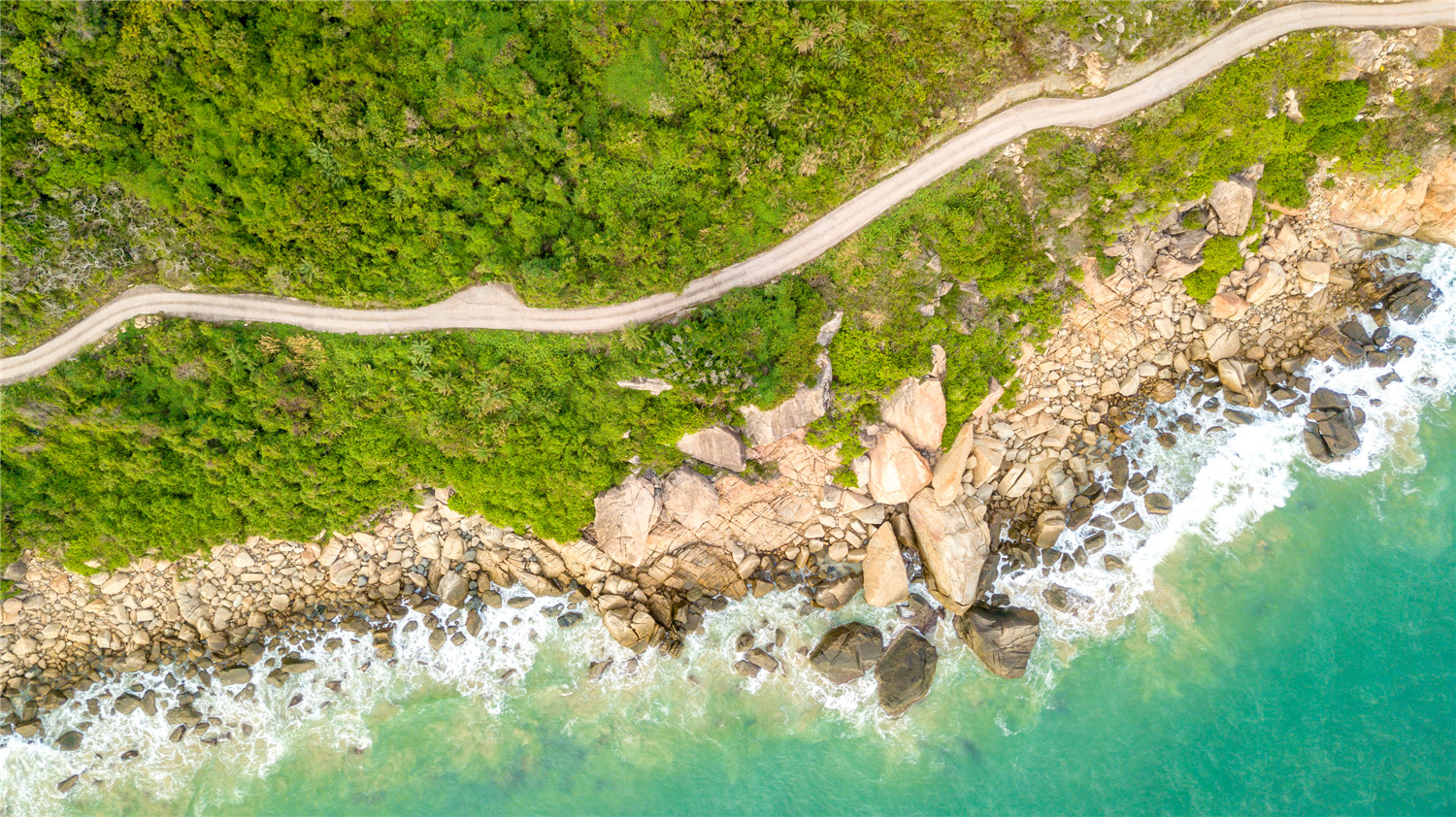俯瞰整座公路,宛若一条白带,将森林划开,碰撞出两道不同的风景线,一面是郁郁葱葱,一面是怪石嶙峋,翠绿的海水宛若一块浑然天成的翡翠,美得让人心醉。