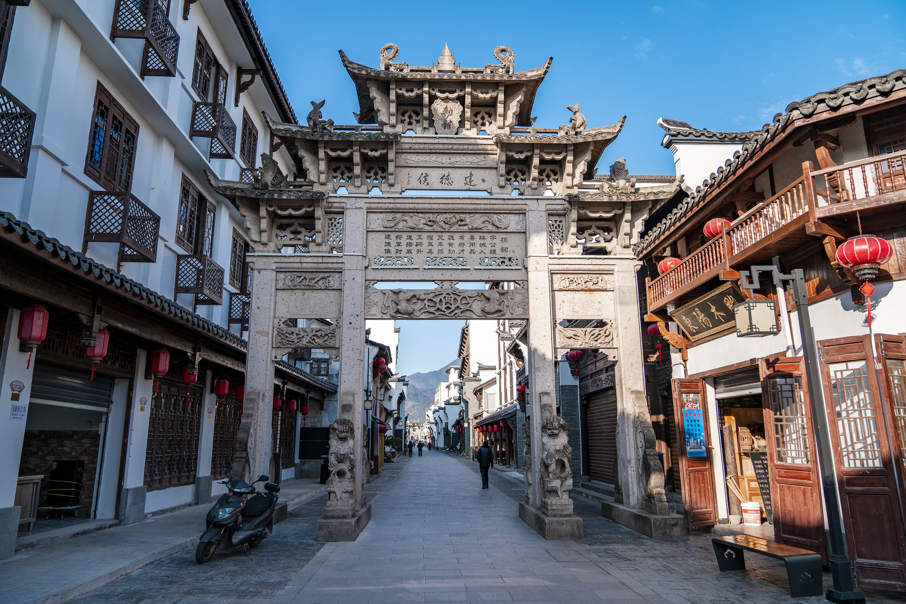 走进梅城古镇内,更近距离的感受这座千年古城,主街还算宽敞,应该是保持着原貌没有多大的改动,可见曾经的梅城是多么的繁华,数十米高的石雕牌坊分立其间,威严大气。两侧是商铺,二层、三层、四层、五层不等的楼房紧紧相连,虽然参差不齐,却非常的和谐,不显杂乱。