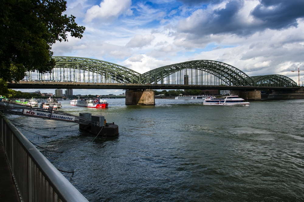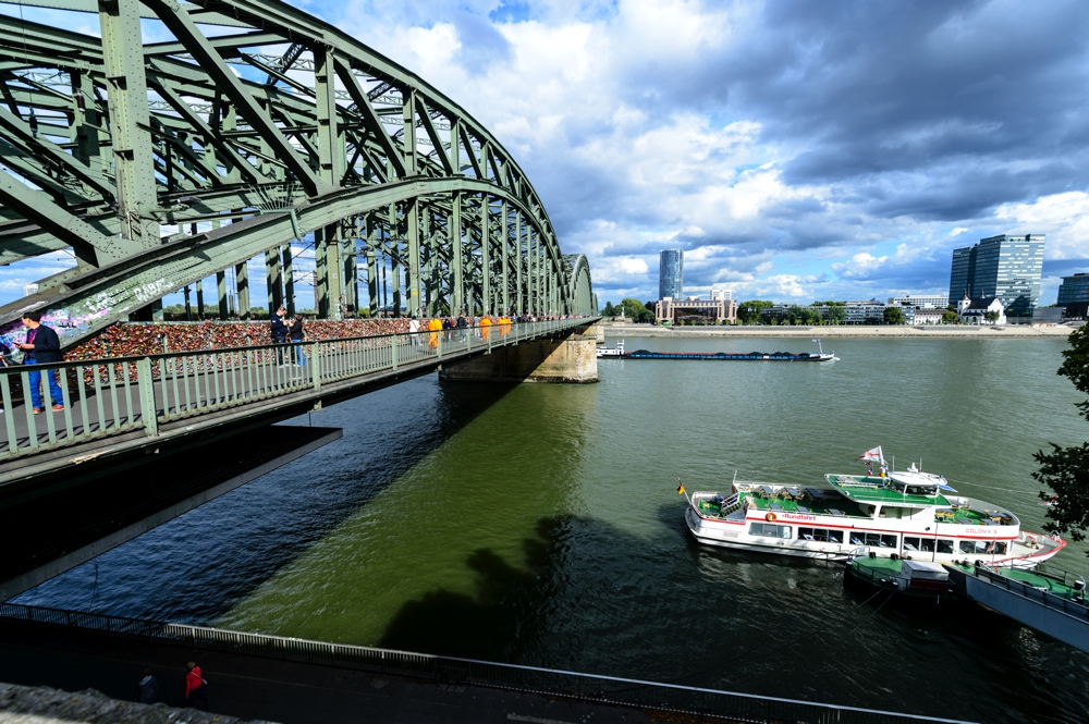 霍亨索伦桥就在大教堂前,这座也有100多年历史的彩虹一般的大铁桥,与科隆大教堂组成了莱茵河上标志性的风景。铁桥中间是铁路,旁边是人行道,而在桥栏和人行道的栅栏上,都挂满了五颜六色的爱情锁,密集得甚至组成了一面墙!人们相信,在霍亨索伦桥上挂上一个锁,将钥匙丢进莱茵河,爱情就可以天长地久。