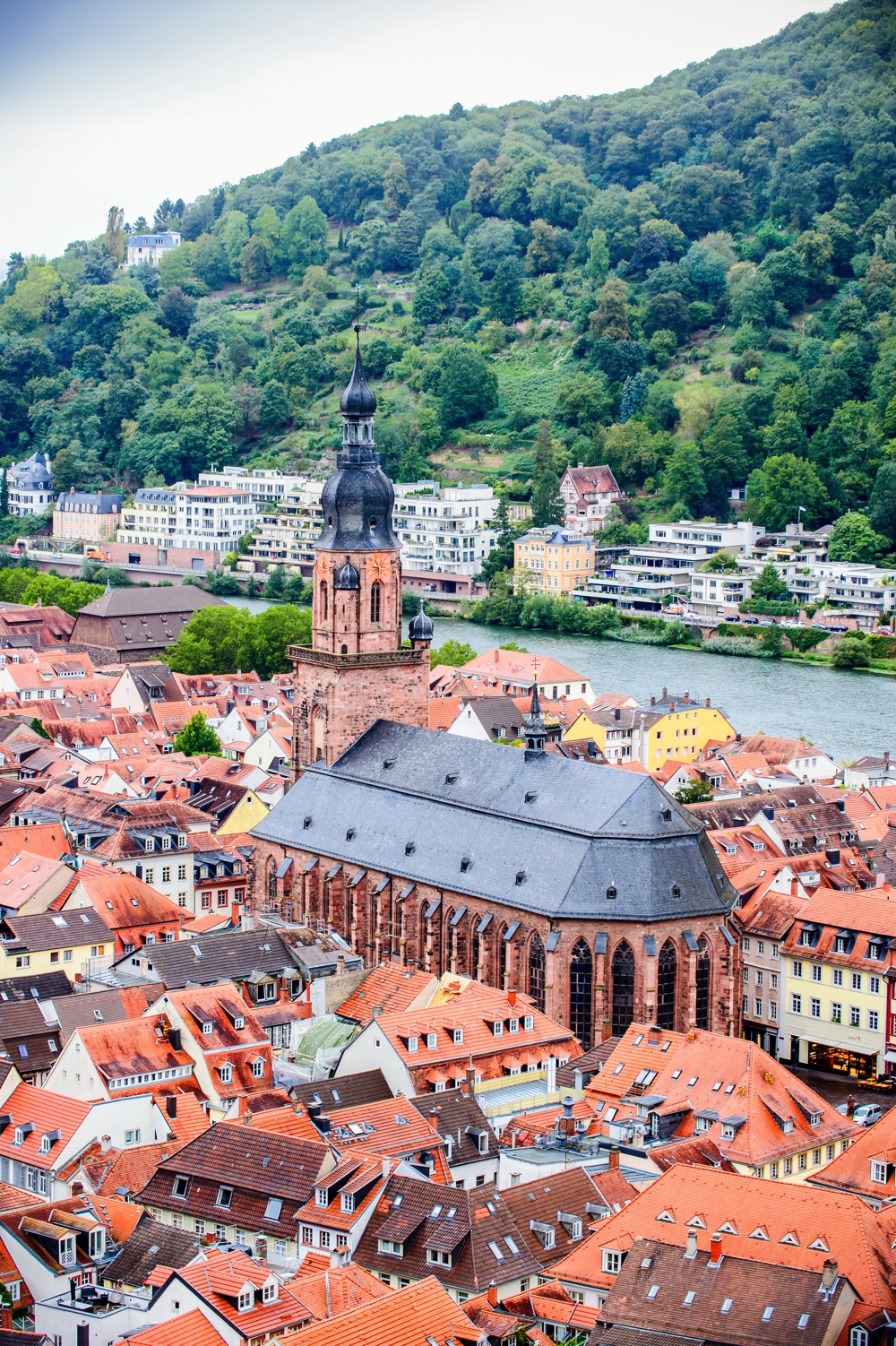德国的秋天还真是多雨,到达海德堡时,由内卡河红色砂岩建造而成的海德堡古堡正沐浴在绵绵秋雨中。据说这里原为法尔茨选帝侯旧宫遗址,有些地方历经天灾战火已有残破,但整体依然保持着古欧洲的风貌。在瞭望塔俯瞰,整座海德堡老城尽收眼底——和古堡相似,这座河畔古城也以红色为主色调。