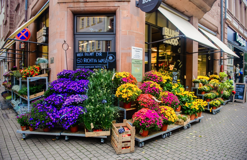 在“晕”过去之前,我站在城中最热闹的“画眉鸟”小巷里,支起脚架,拍下这个花团锦簇,洋溢着德国式热情的地方。这条宽3米,长140米的窄巷在吕德斯海姆老城的中心,建在一条斜坡上,文艺小店、餐厅、酒馆比比皆是。在巷口,一只画眉鸟的铁艺标志是这条小巷的标志。