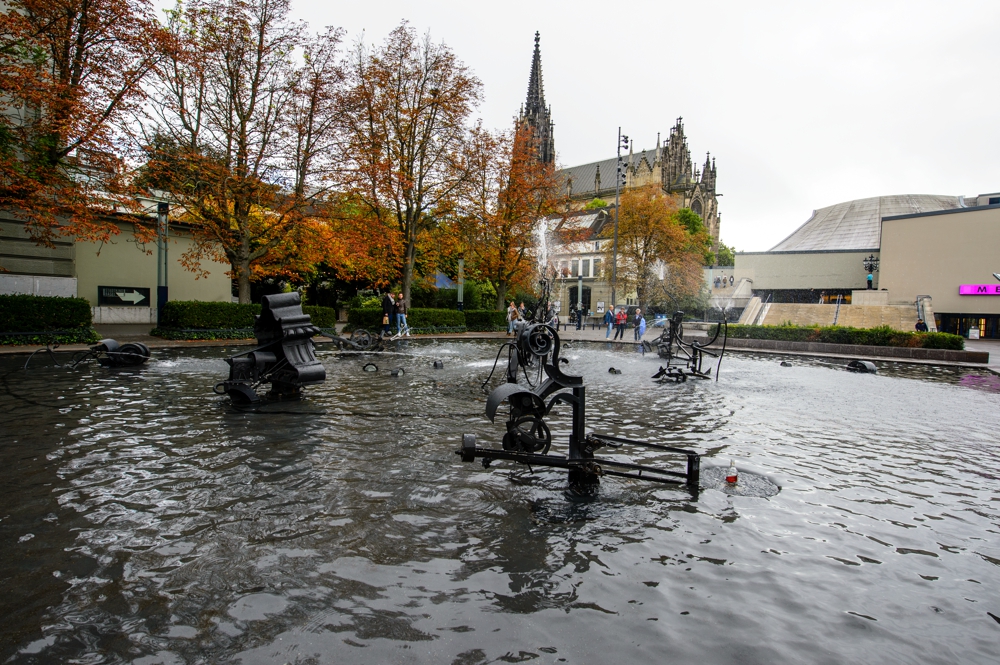 秋天的巴塞尔阴晴不定,淅淅沥沥的小雨浸润着这座莱茵河畔的城市。如若不是雨丝渐密,我想我会在丁格利喷泉待得更久一些——这座在巴塞尔原剧场旧址上的喷泉,是由艺术家丁格利(Jean Tinguely, 1925-1991)用原剧院遗留的舞台设备、废旧零件组合而成的能“表演”水舞的装置,运动起来,颇有趣味。