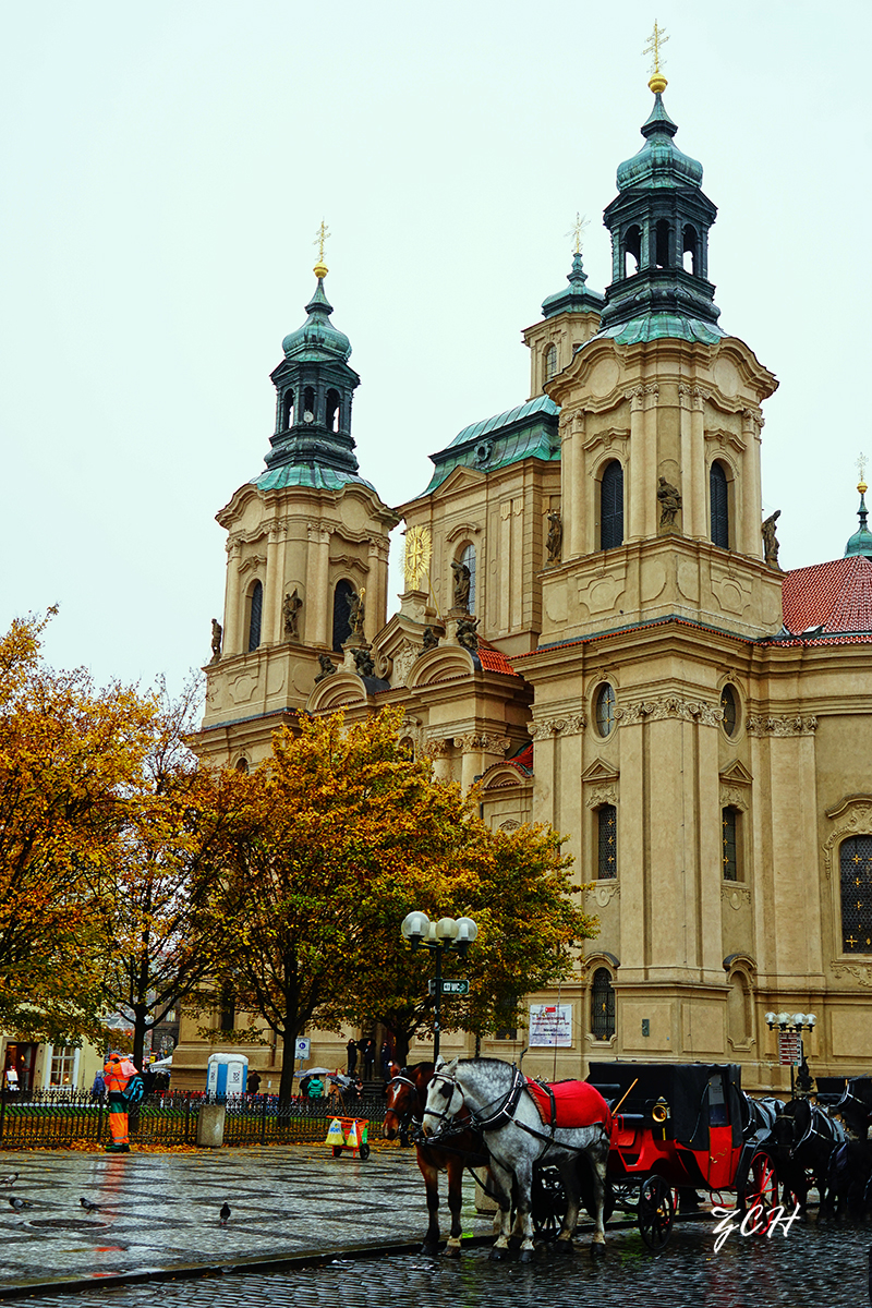布拉格 有好几座 圣尼古拉 教堂,远处绿色的穹顶的恢弘高耸着,让人很难不注意到它。教堂是经典的巴 洛克 风格,流光溢彩,在红屋顶中调色添彩。