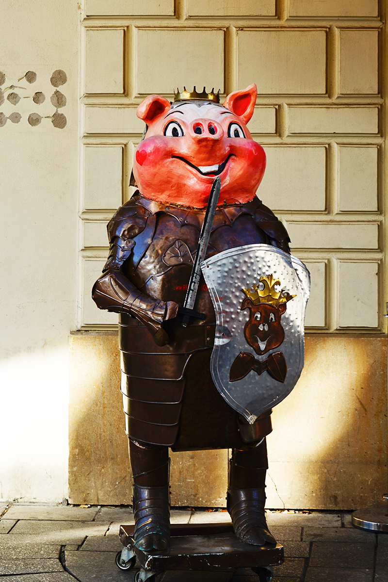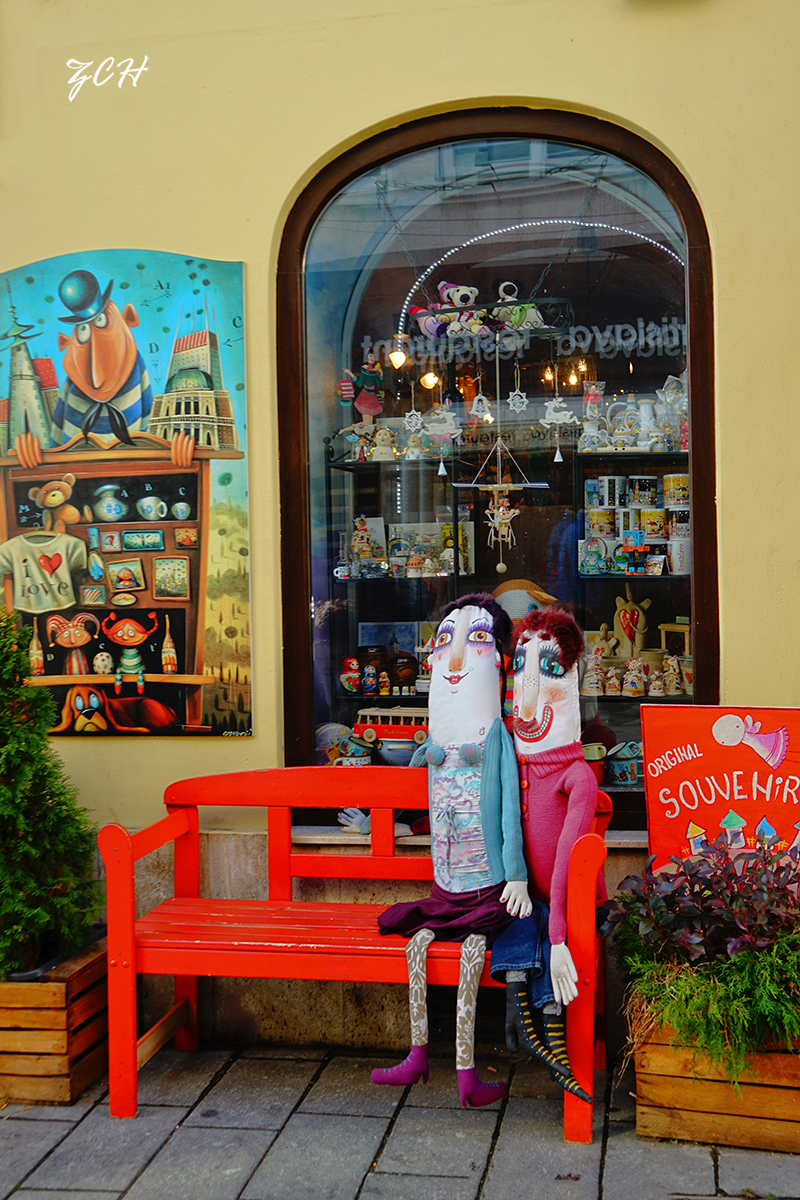 咖啡馆门前的这些可爱人偶给老城增添了一份喜剧色彩。