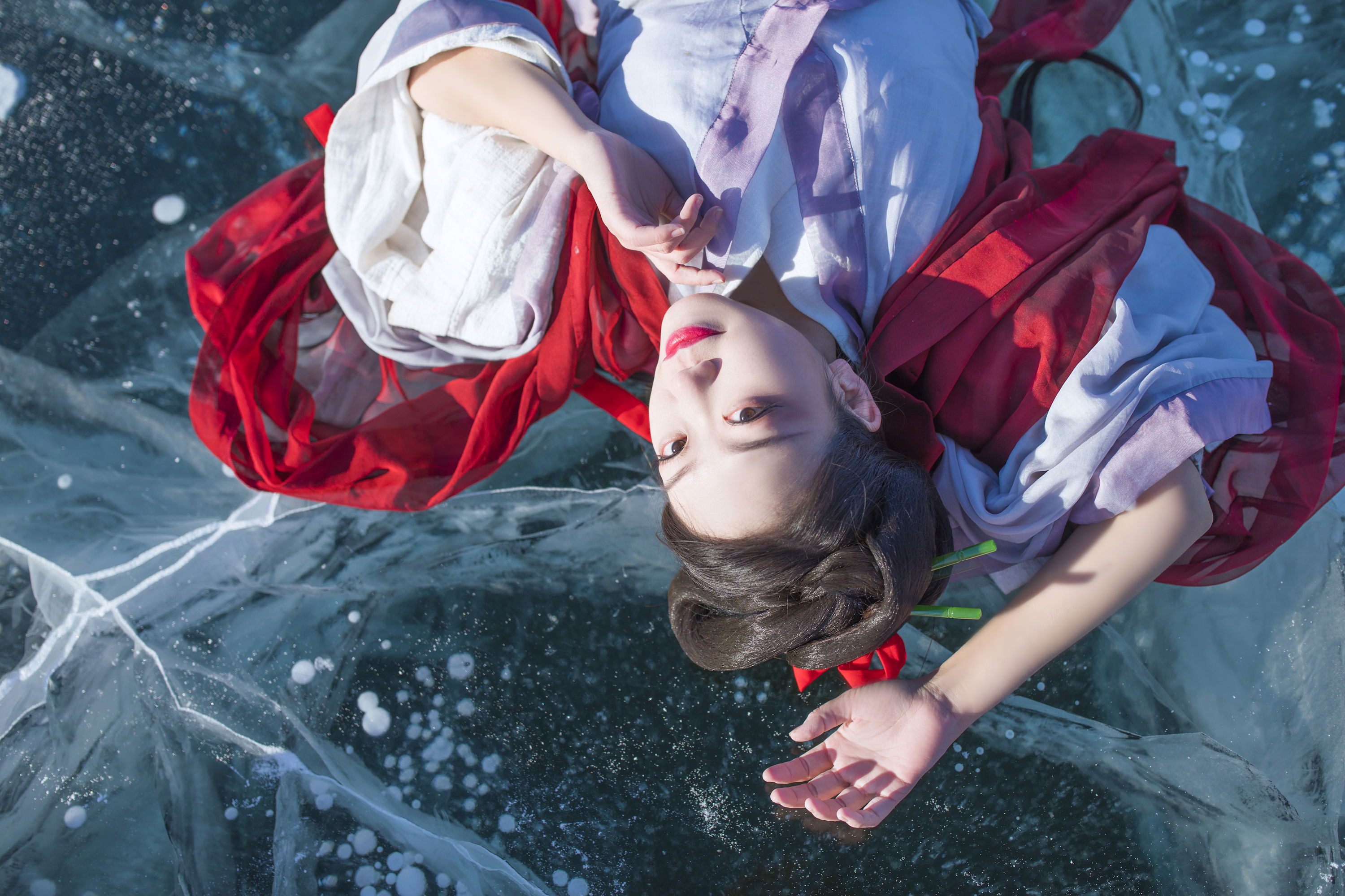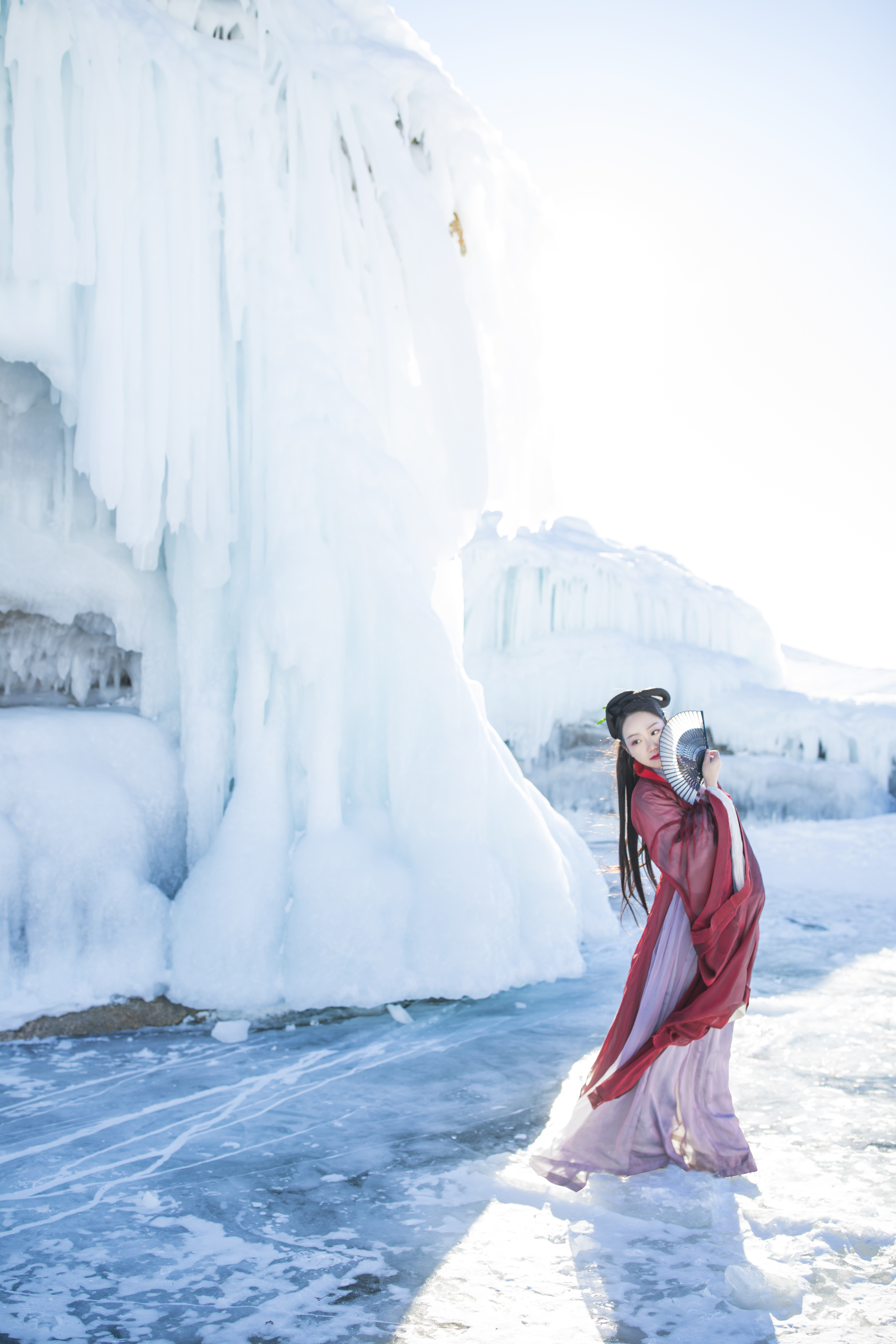 这次来贝加尔湖除了自己要拍风景,还带了汉服来拍人像,北线的这天穿的是菩提雪的月慢,还有红色、米色斗篷各一件搭配着穿。明制的汉服最大的好处就是里面可以穿很厚,我里面上身穿了三层羊绒衫,贴了十多片暖宝宝,下面因为裙子比较大摆就更无所谓了,秋裤加羽绒裤加防水冲锋棉裤,鞋子也是专门的雪地防滑靴,买大了两号里面可以穿超厚的羊毛袜。鞋子和冲锋裤都是哥伦比亚的,实践证明很靠谱~~今年的贝加尔湖相对于往年真的不算特别冷,零下20多度,只要不刮风这一套还是可以的,就是穿着汉服拿着单反拍照有点行动不便。